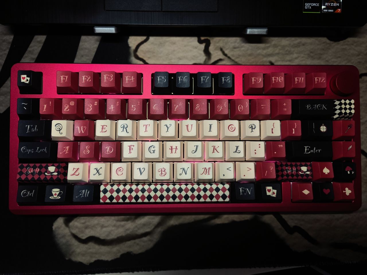 挑挑选选,看上了它家的同系列hi8,进群一打听,发现又要出加强版,果断硬等一个多月,一口气抢了两个,红色和粉色,最后留了红色,粉色出给了有缘人。至于键帽,没错,又是闲鱼收的,150。