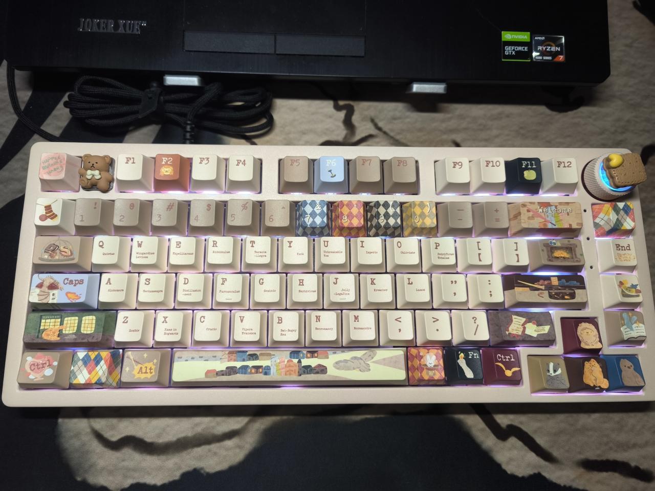 后续是在一个自己关注的up主那收的送测,价格很合理,准备搭配的轴体是蹲点抢的y3轴(目前尚未上机,故不做评价,但市场反应很好),键帽依旧是闲鱼二手货,目前还在路上,强迫症,还是找了别人的做预览图,侵删,组装好大概就是这样。(图上是x75v1,外观上与v2差距不大)