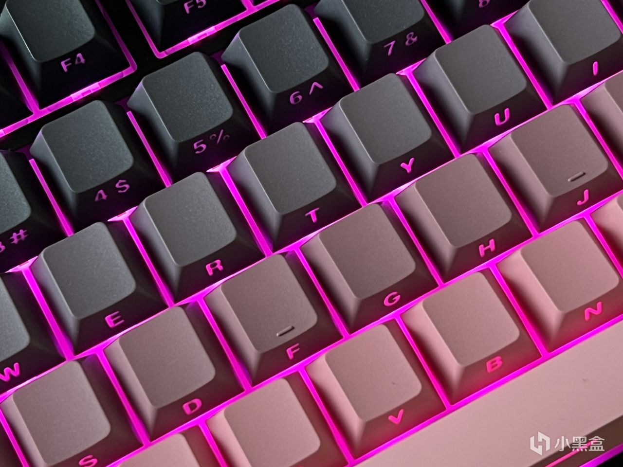 而且键盘整体的高度也设计的刚刚好,就算不搭配掌托使用也不会觉得有丝毫的难受,再加上采用的是PBT注塑键帽,优点应该不用我再说了吧,PBT注塑好就好在长久使用也不会掉色和打油,主打一个用再久也不影响颜值,做电竞桌上最靓的仔好吧。