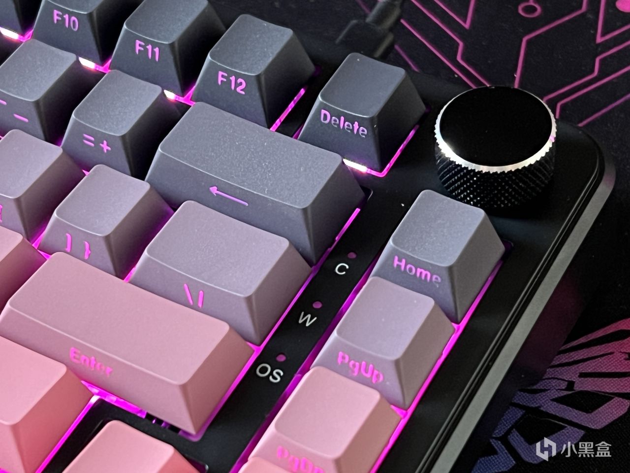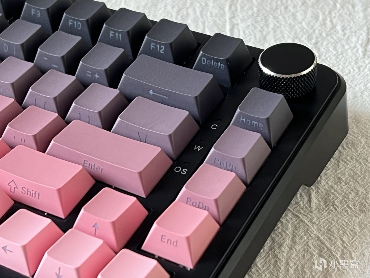 看到键盘,可以看出黑爵AK820Max是一把标准的75配列的键盘,为了最大化平衡游戏和工作效率,键盘将功能键设置在了F区,同时还配备了一枚金属音量旋钮,这颗金属音量旋钮的质感做的相当不错,同时也是具备一键静音功能的,使用起来十分的方便。