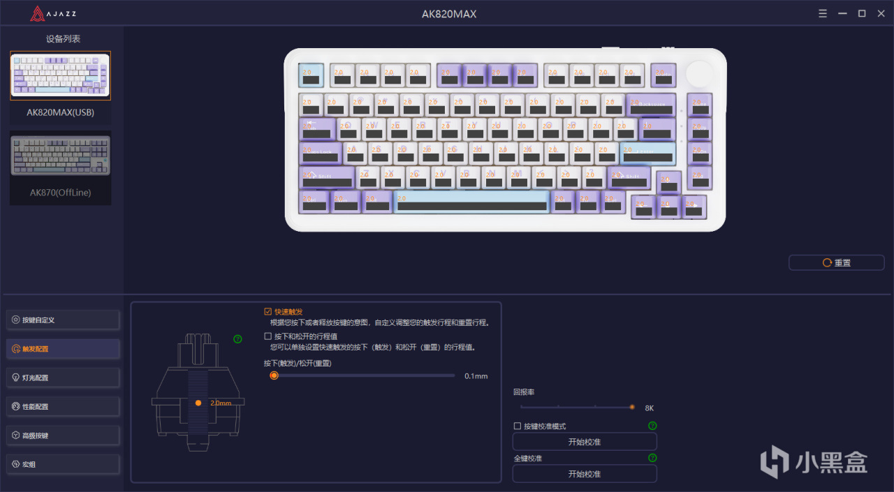 当然,毕竟是一把磁轴键盘,因此不管颜值再怎么能打,提供情绪价值的能力再如何强大,最终还是要落实到轴体以及性能上面来的,黑爵AK820Max所搭载的是黑爵定制的禾金代工磁轴,出厂已润,手感顺滑,总行程4.0mm,轴体寿命一亿次,全行程压力50gf,RT可调节范围0.1-2.0mm,可调节精度0.1mm,同时除常规改键外,还支持DKS、MT、TGL等功能,十分的强大。
