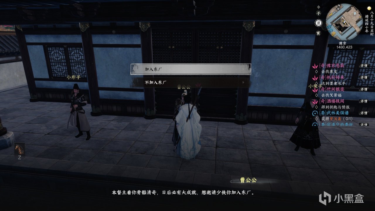 在完成前置任務後我們來到東廠,座標(1480,423)。與東廠曹公公對話就有了加入東廠的選項。從曹公公口中我們可以得知東廠晉升的方法非常簡單,就是接取懸賞任務完成即可。