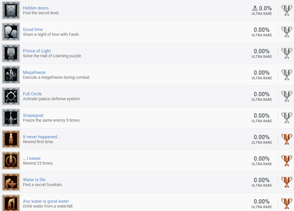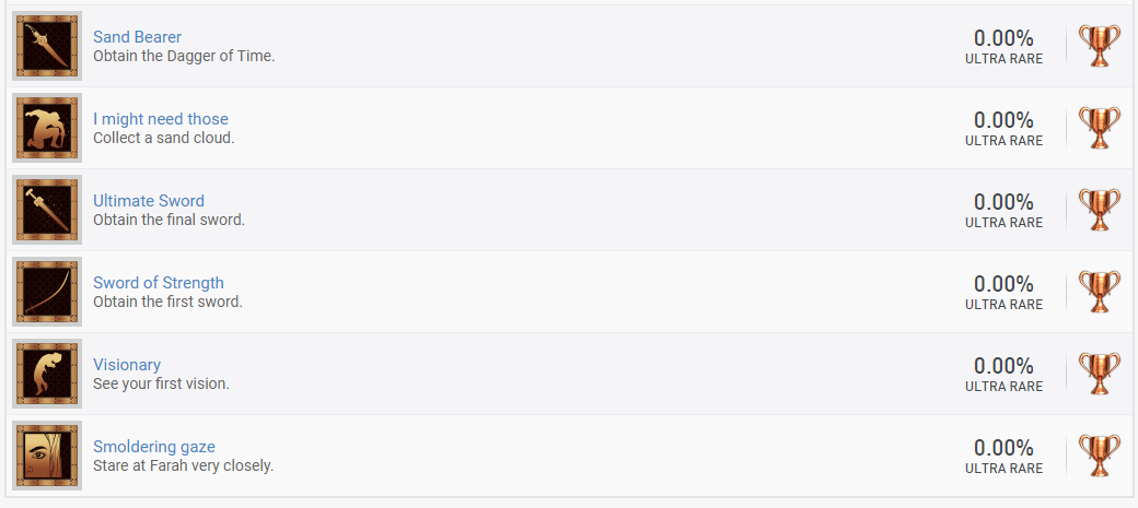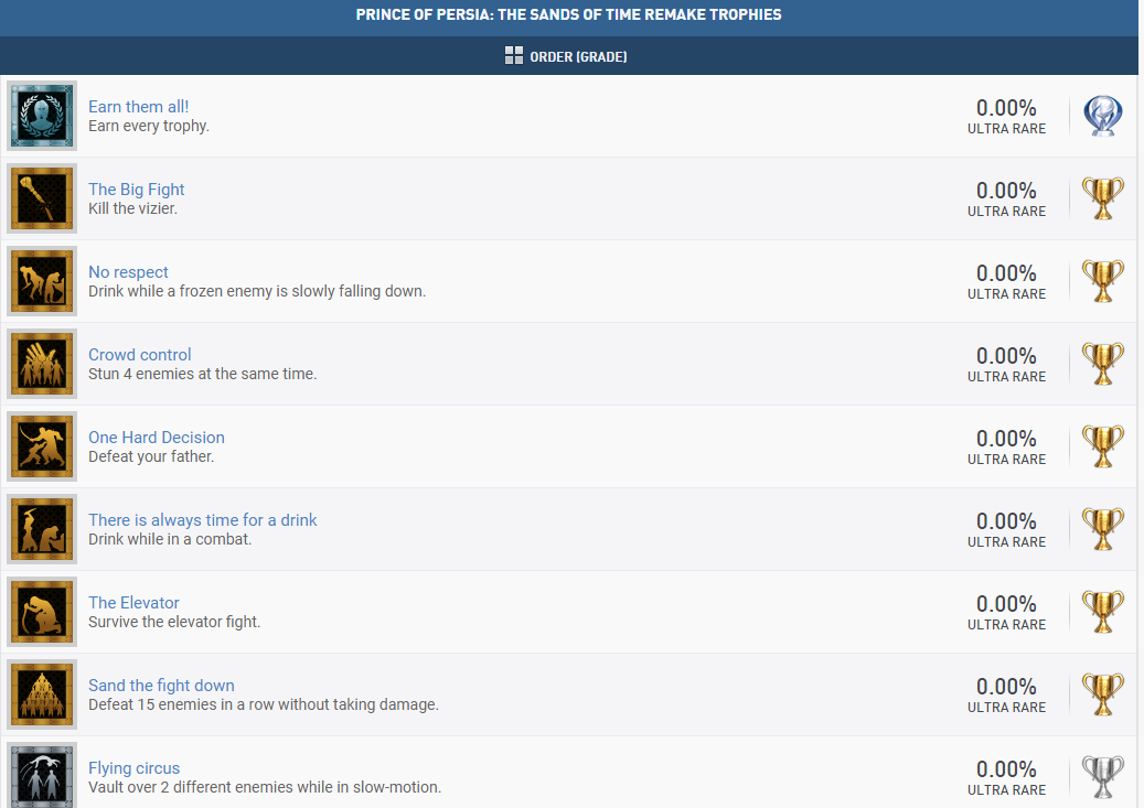 據PSNProfiles顯示,《波斯王子:時之沙 重製版》PS4版一共有25個獎盃,包括:10個青銅獎盃、7個銀獎盃、7個金獎盃和一個白金獎盃。