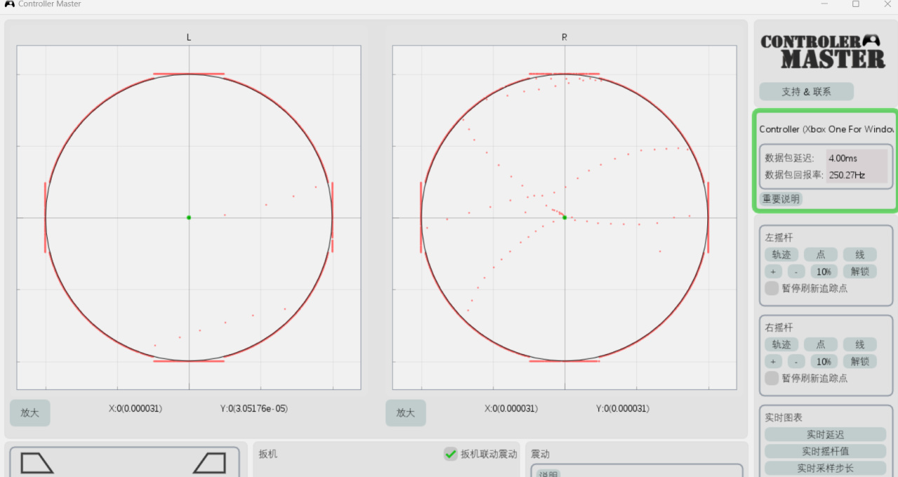 那离谱之出就来了,这个摇杆算法是矩形,实操起来玩fps游戏并没有那么实用,甚至还有种没有关掉死区的感觉