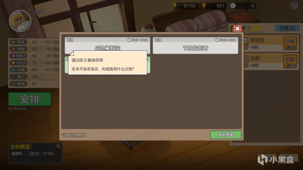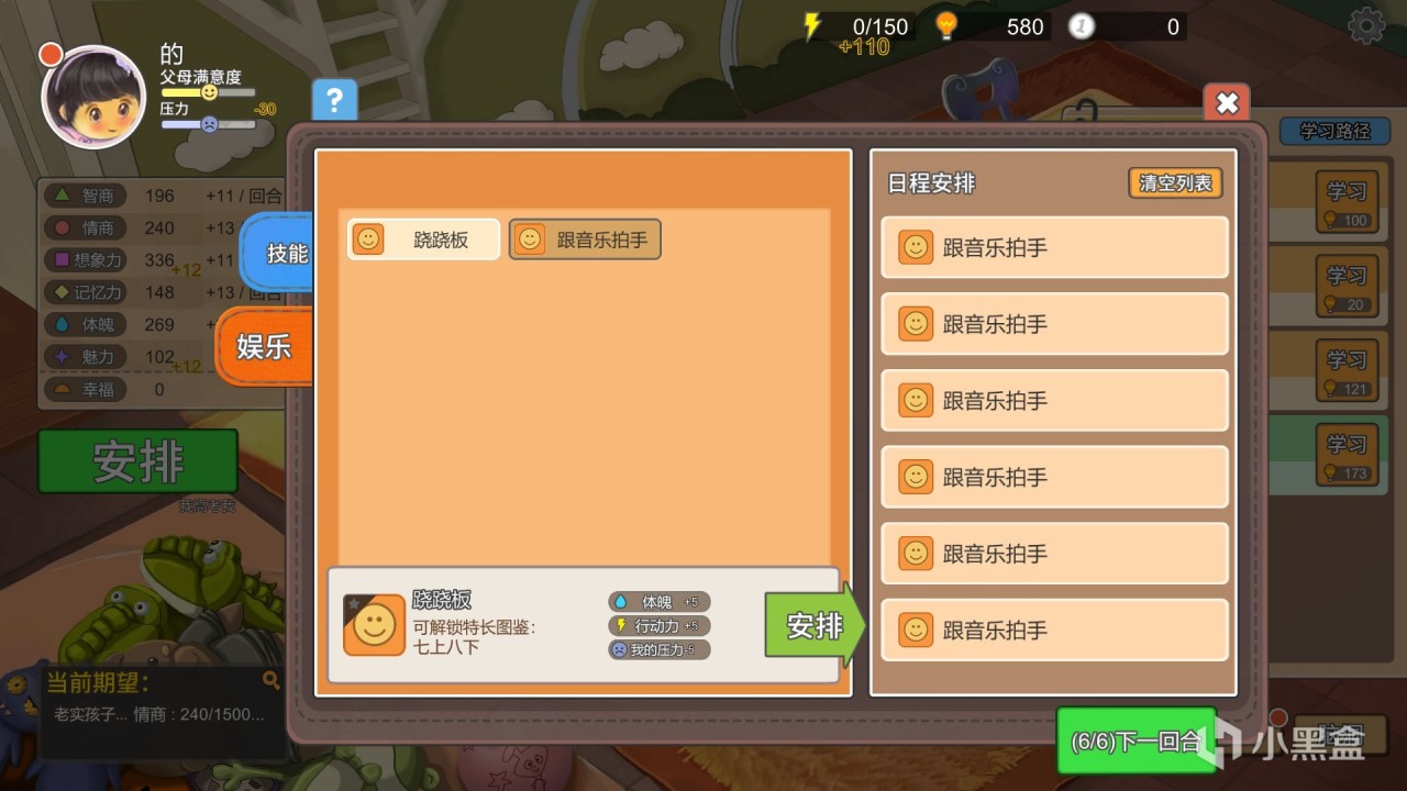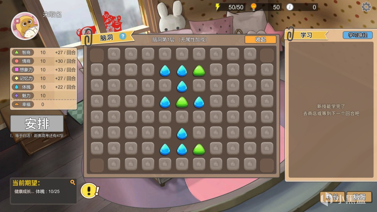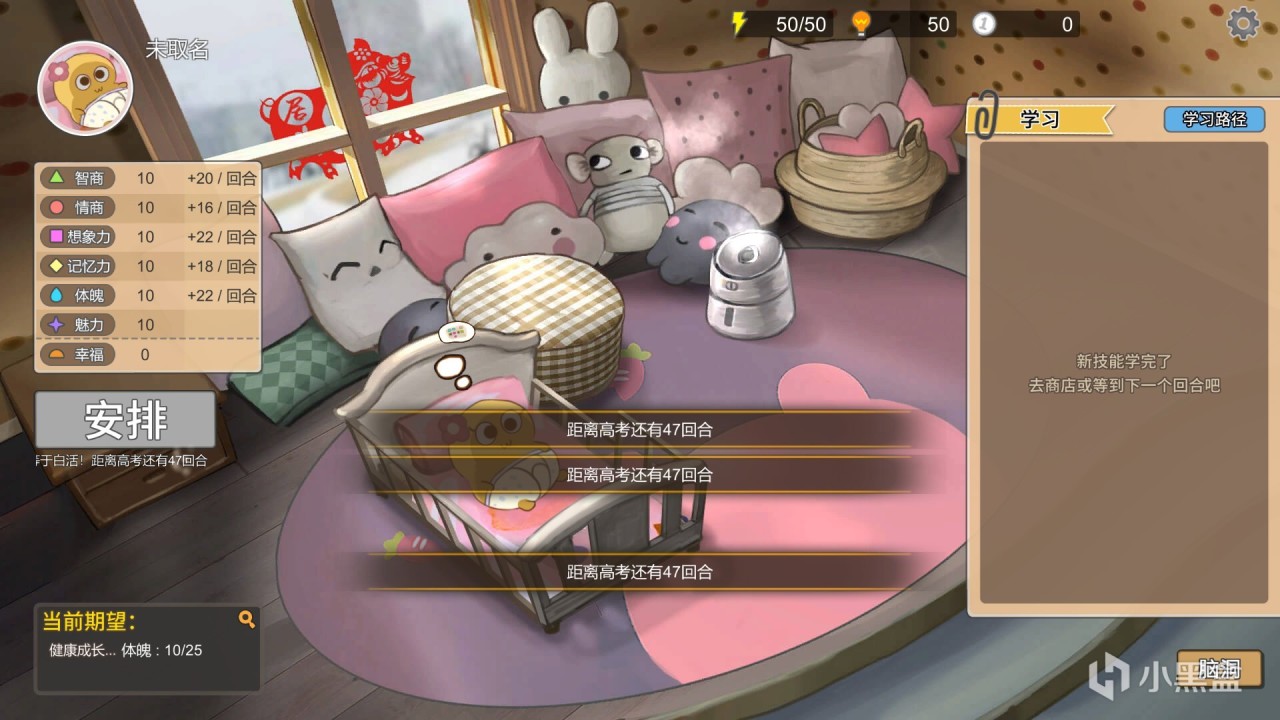 學習,索取,商店玩法:在開局,玩家只有兩個日程安排,分別是跟音樂拍手,爬行,雖然隨着回合數的推進,玩家會獲得一些新安排,但給的數值獎勵實在是不敢恭維,所以玩家需要花費“悟性”去學習更多課程和技能,並且這些課程