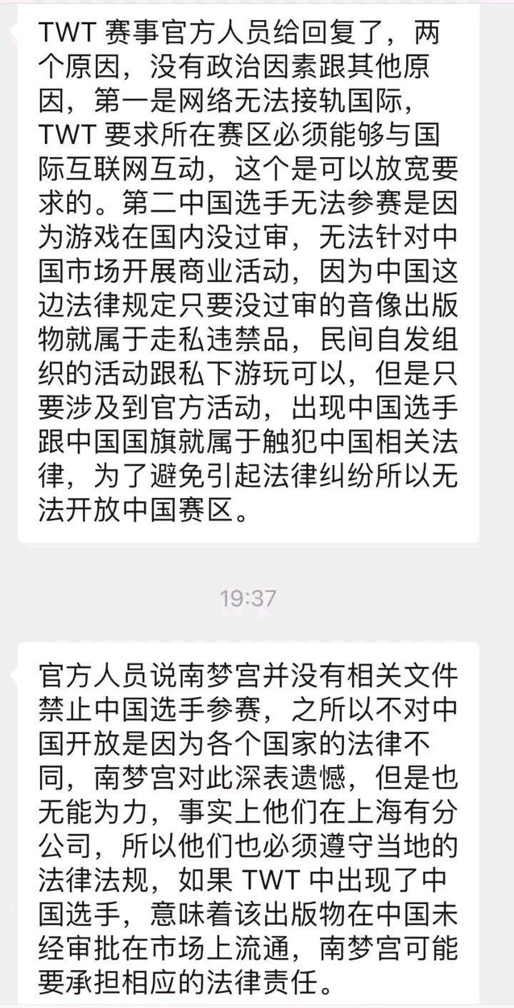 中國選手小陳陳報名鐵拳比賽被南夢宮工作人員告知:中國選手即使在比賽中獲得積分和名次,也無法獲得獎金,無法在TWT積分榜上排名。