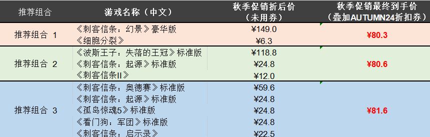 《刺客信條:幻景》+《看門狗:軍團》(24.8 元檔的三款遊戲都可以)+ 2 元的 DLC,滿 150 元使用代碼 AUTUMN24 立減 75 元,最終到手 76.62 元: