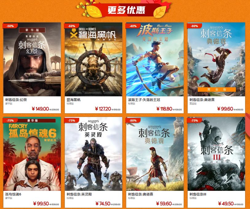 育碧商城迎來了全系遊戲促銷活動,除了遊戲本身的折扣外,結賬時單筆訂單超過 150 元,輸入優惠代碼 AUTUMN24,即可立減 75 元!需要注意的是該折扣碼不可用於虛擬貨幣、預購商品、錢包充值、訂閱服務和遊戲內道具,不可與 U 點券疊加。
