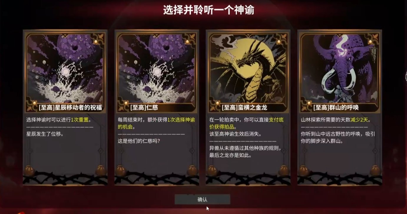 收集到足够的神谕后,在血月降临之时,可以召唤至高神谕,至高神谕有永久生效和单次生效的,根据收集进度的不同,选取不同的神谕有着很好的效果。
