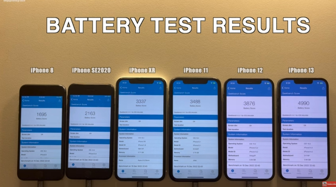 跟 iOS 16.1 版本一樣,這次 iOS 16.2 測試的 iPhone 型號有:「iPhone 8、iPhone SE2020、iPhone XR、iPhone 11、iPhone 12 與 iPhone 13」,使用 Geekbench 的電池測試模式,因此跟現實使用的續航力一定不太一樣,但至少可以比對操作系統版本差異。