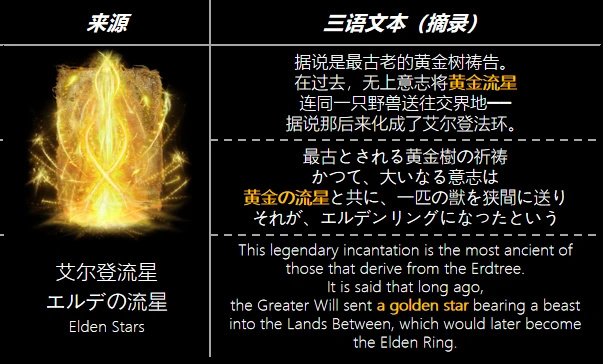 回顧艾爾登流星的文本,英文文本中強調了黃金流星只有一顆。雖然這裏也可能是日譯英的錯翻,但艾爾登獸的原文都強調了只有“一匹”,可見翻錯的幾率不大。至於流星禱告本身效果會散發許多黃色星星,其實就是繁育艾爾登獸的結果——產生更多的黃金流星。