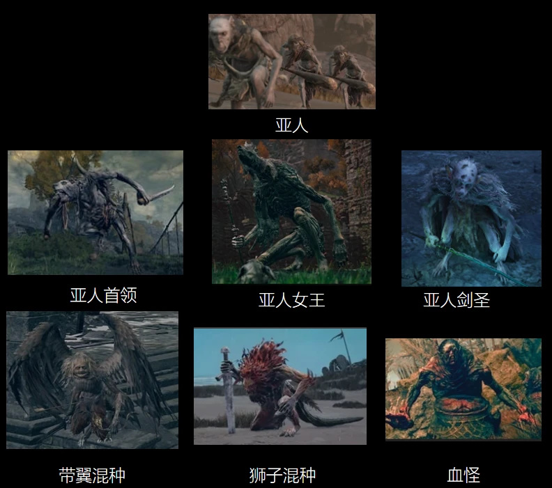 亞人(Demi-Human)是半野獸半人的羣居生物,有一定的智商和原始文明,喜歡黑暗的環境。他們身上發生“百相”變異的概率似乎非常高。從形象和物種分佈上猜測,很可能是未受初始古龍賜福的獸人演化而來的種族,甚至猜測他們是人類的前身。