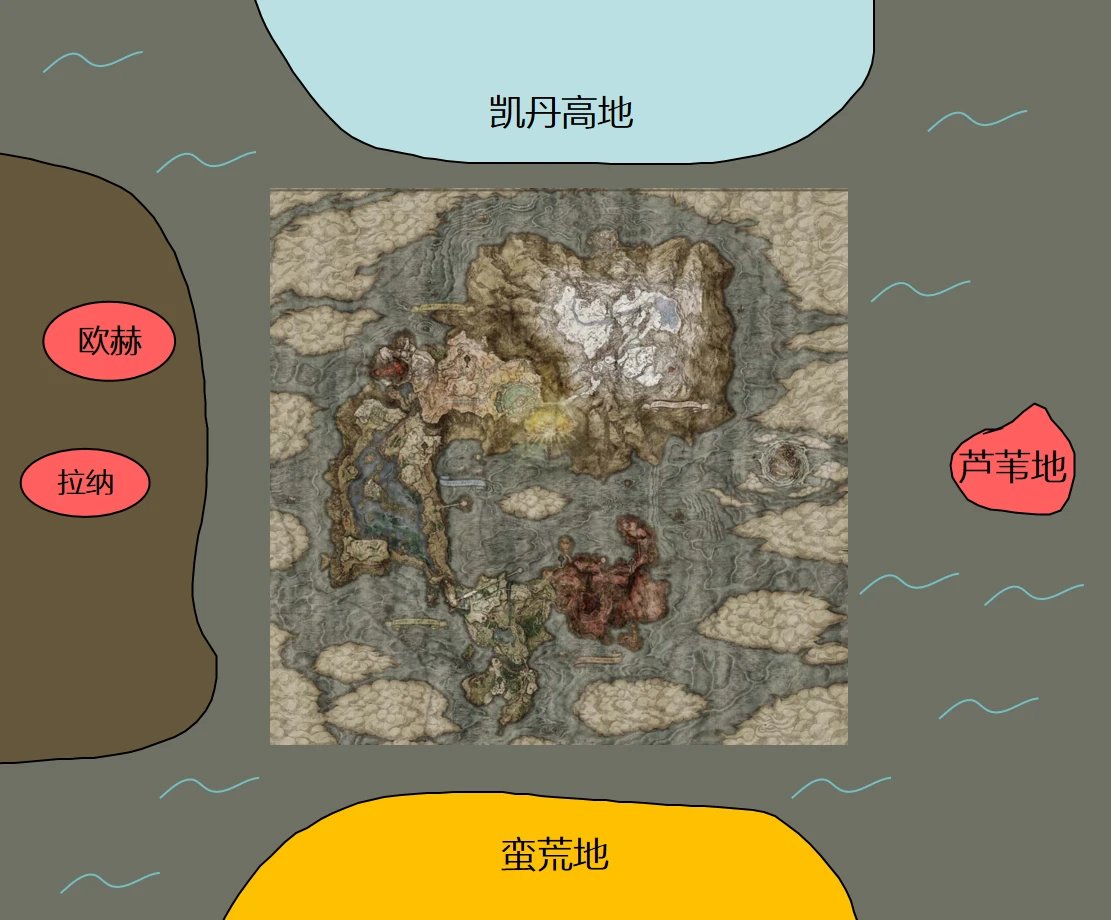 論地理方位,凱丹高地在北方,蠻荒地在南方,歐赫與拉納在西方,蘆葦地在東方。