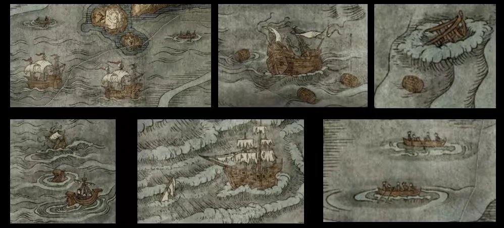 通過羊皮紙大地圖上海洋部分的細節,我們可以發現海洋是片很危險的區域,但人類仍然在嘗試征服它。