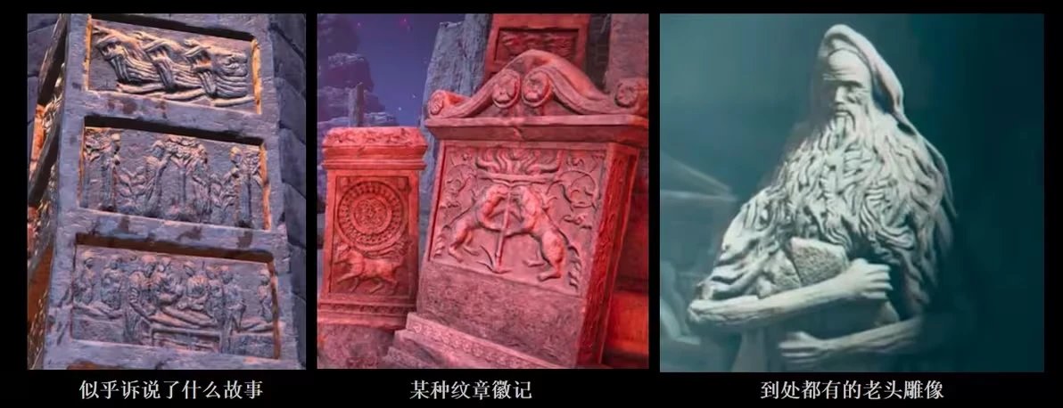 古王朝的泥人神官會使用泡泡魔法,試圖從泡泡中尋找到失落的神諭。另外,在古王朝文明中,有一名老人形象的石雕非常常見,存在感十分強烈,似乎被泥人們所崇拜。由於沒有文本對其定義,猜測有許多,爲了方便討論,外網爲他取了個諢名——根鬚老者(elden john)。
