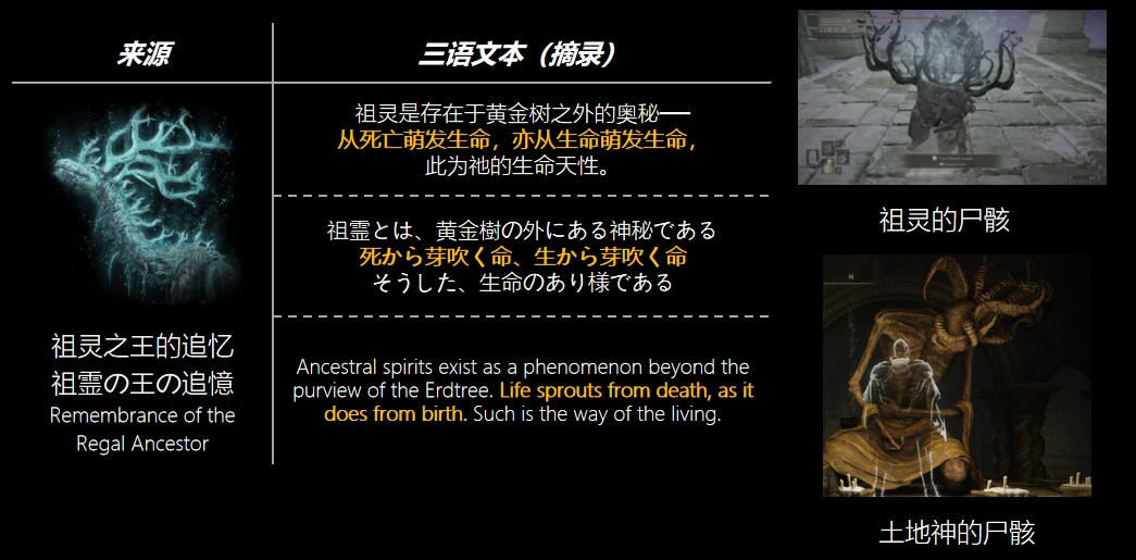 祖靈這種生物的萌芽之角,不僅是肉體上的角,也是靈體中的角。或許我們可以這麼描述:祖靈是以命定之死以及熔爐百相崇拜混合而來的象徵性信仰。