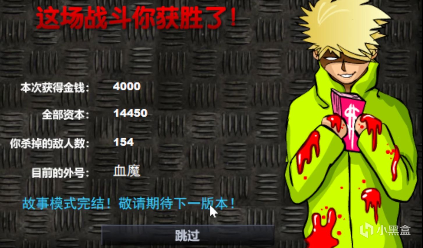 游戏中每次胜利都可以看到Andy浑身占满血,拿着自己赢得的钱。游戏还会记录你杀掉的人数,随着你击杀的人数越多,你的称号也会变得更加残忍。