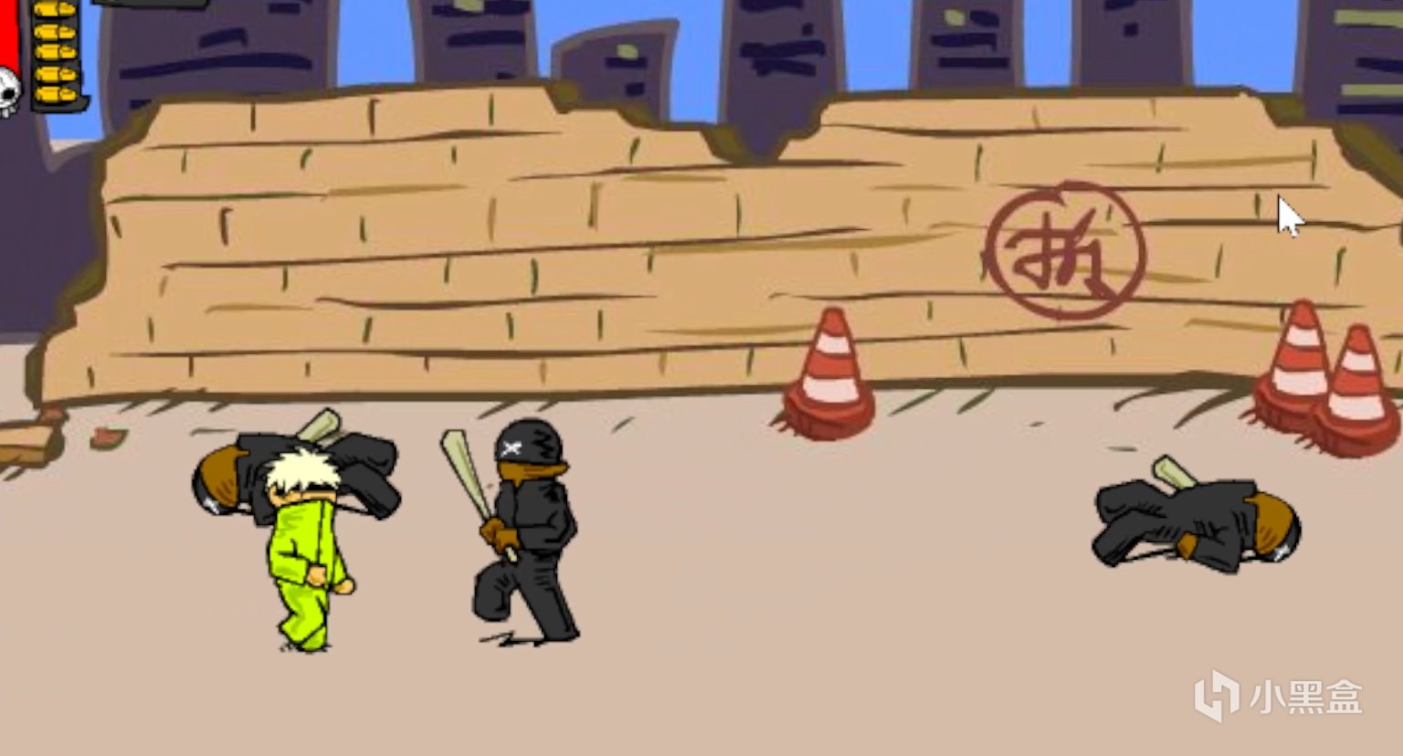 在第一个街道的场景中,出现的第一类敌人满副“黑”装,一身黑衣外加一个棒球棍,典型的炮灰。在这个场景中还有着机器人,没什么特点,铁头铁脑,有俩个机械手臂伸在前方,冷不丁夜壶给你来一下,但还是个炮灰单位。