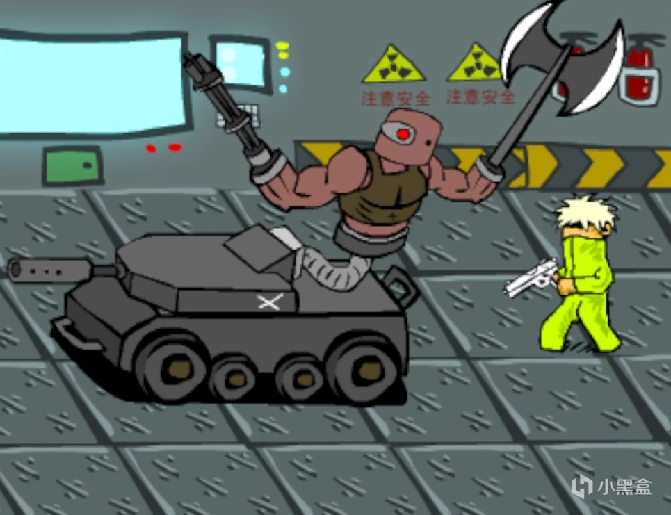 见到最后一个boss,才意识到什么是真正的缝合怪,身子是坦克,左手加特林,右手大斧子,眼睛装了激光,就差脑袋没有改造了。攻击方式也是四种类型,激光眼,斧子,坦克和加特林都物尽其用。