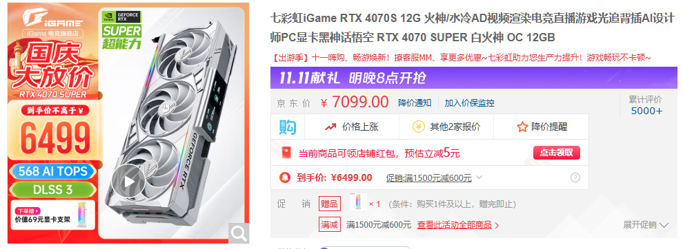 比如同样是RTX4070S显卡,新一线品牌、七彩虹旗舰型号——火神,到手价格6499元: