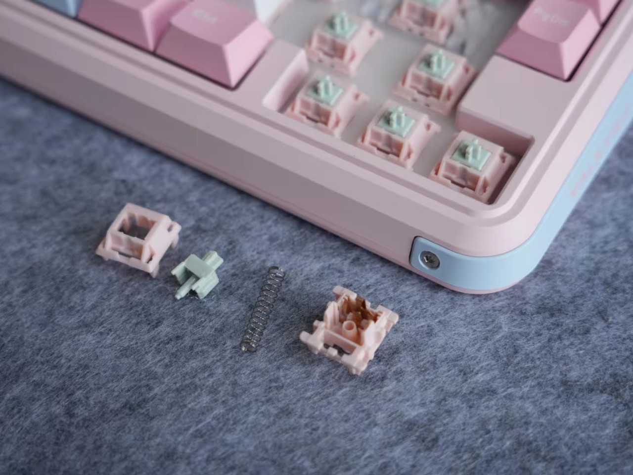 VK75的轴体采用是采用旭华的幻粉轴,轴体整体的配色也是粉粉的和键盘的粉色外壳非常搭配。而在材质方面也是pom外壳,pok的轴心且带有出厂润滑,手感非常顺畅。