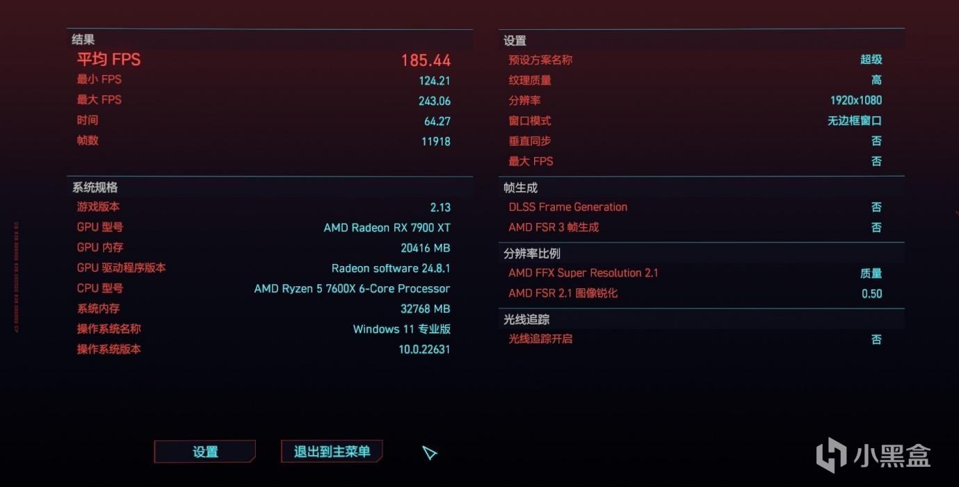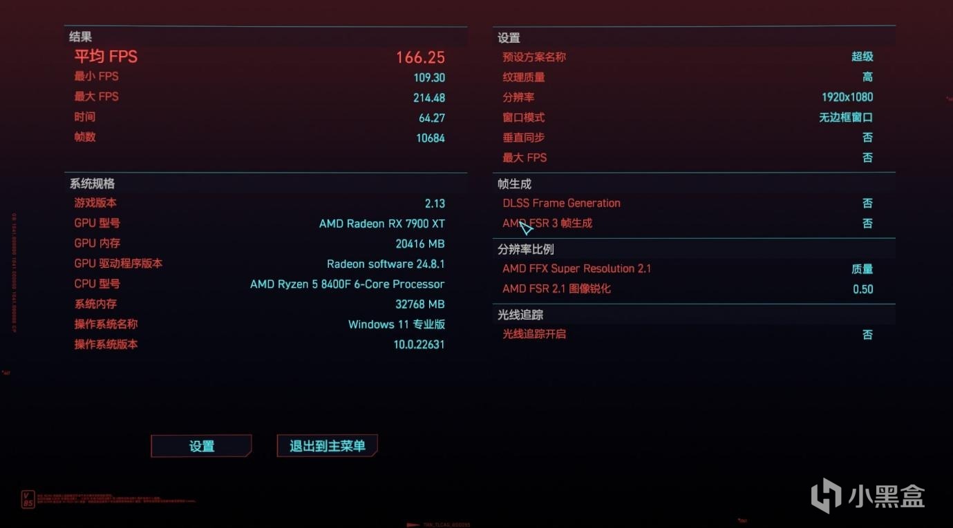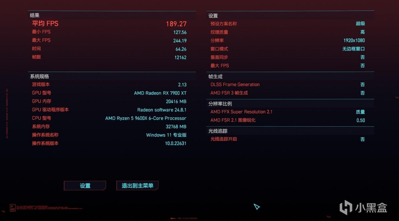 赛博朋克2077,1080P分辨率,超级预设下,三个CPU下帧率分别是166.25帧,185.44帧,189.27帧。可以看到帧率还是有些区别的。
