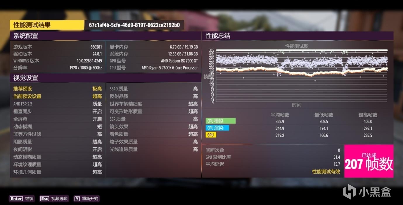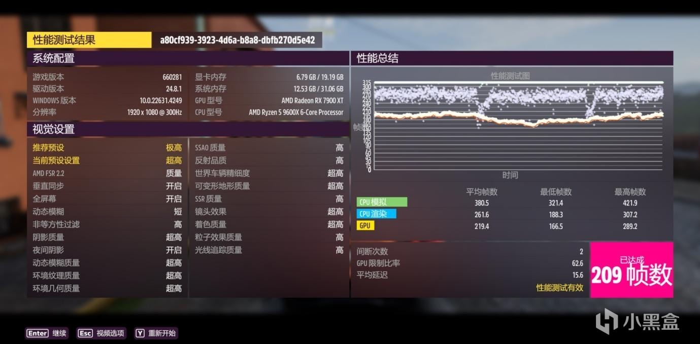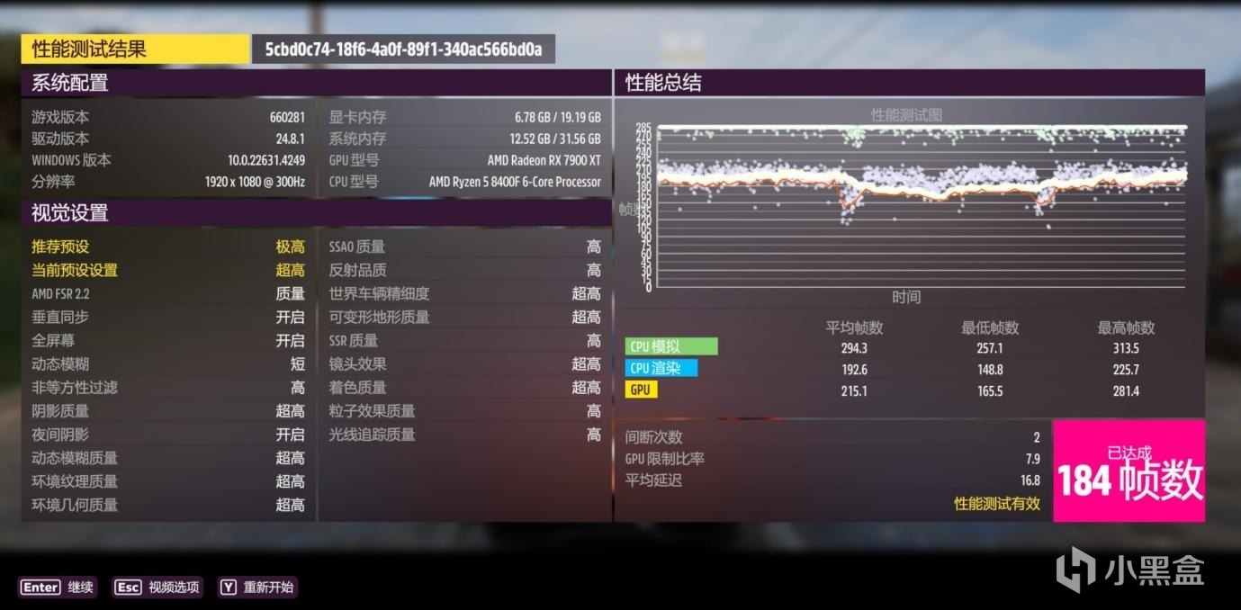地平线5,1080P超级画质下,三个不同的CPU显示达成帧率分别是184帧,207帧,209帧,也是略有影响。说到具体的项目,8400F下,平均帧数CPU模拟294.3,CPU渲染192.6,GPU215.1。7600X下,平均帧数CPU模拟362.9,CPU渲染244.9,GPU219.2。9600X下,平均帧数CPU模拟380.5,CPU渲染261.6,GPU219.4。