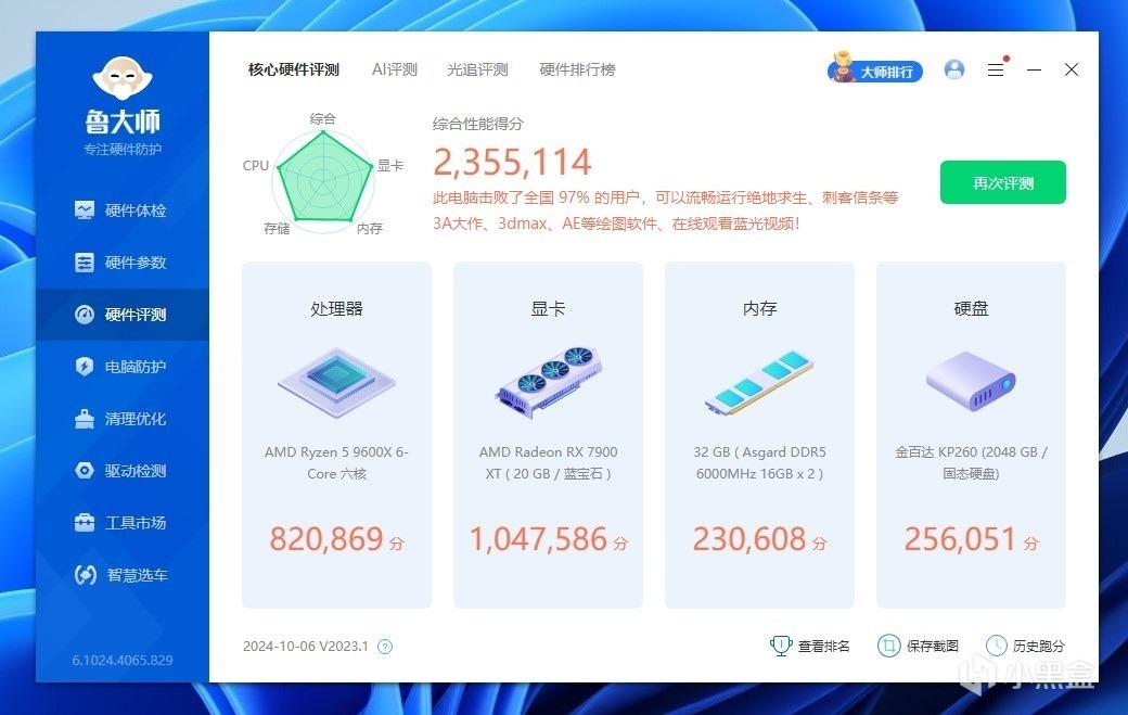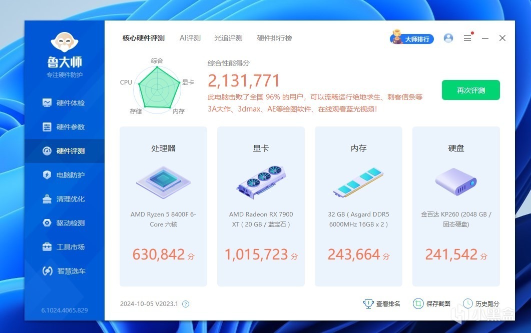喜闻乐见的鲁大师跑分,CPU部分分别是630842,715016,820869,其他各项大致相同,有些浮动是正常的。这里要提一下的是,由于8000系列架构的设计原因,使用8400F时PCIE插槽仅供工作在PCIE 4.0x8的模式,当然这个对于显卡来说基本没有影响,我想也没有人用4090显卡而用这些CPU吧。