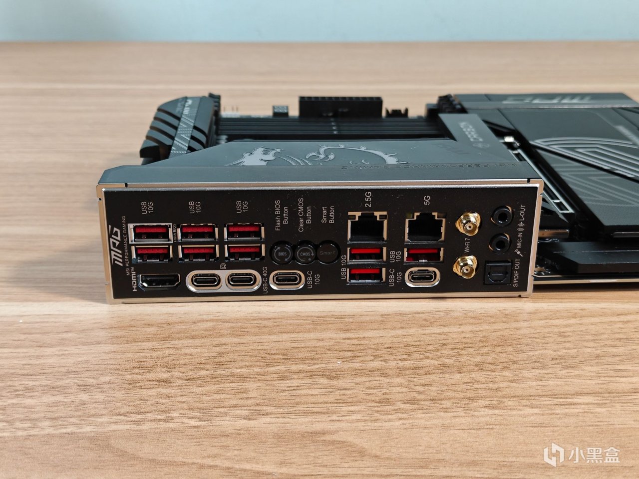 一体式IO接口,密密麻麻布满了。7个红色的USB 3.2 Gen1接口,4个USB-C接口,其中左侧的2个是USB4 40Gbps,右侧的2个是10Gbps。2个有线网卡,左侧的2.5Gbps,右侧的5Gbps。2个无线天线接口,插接式,一按即可,安装非常方便。最右侧的是音响和光纤接口。中间3个黑色的按钮,分别是板刷BIOS按钮,BIOS恢复默认按钮,智能自定义按钮,可以自定义功能。如此丰富的接口种类和数量,可以满足大家的多种需求了。
