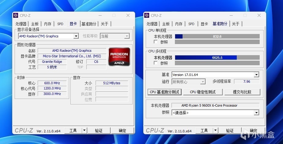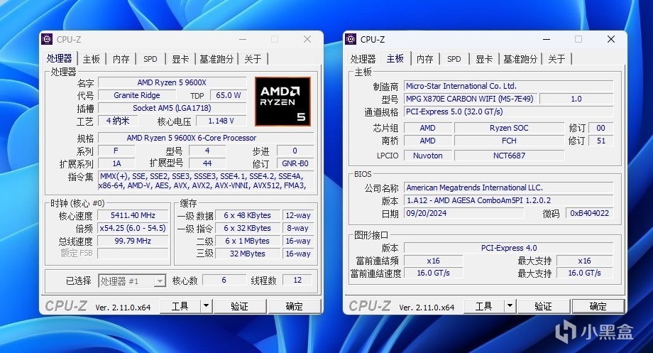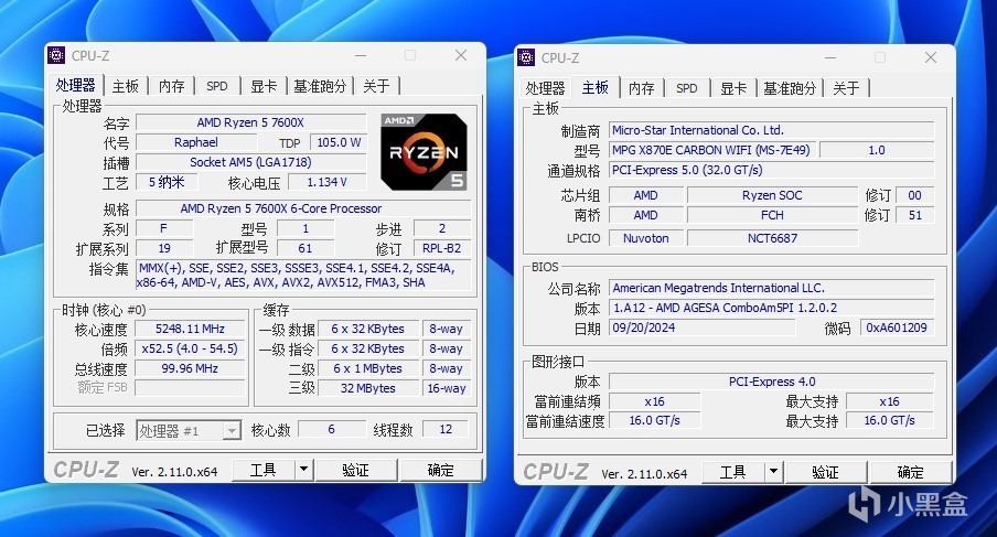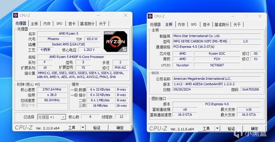 通过CPU-Z,我们看同一个主板,微星的MPG X870E CARBON WIFI。处理器方面都正确识别,均为6核心12线程处理器,可以确认三级缓存,8400F只有16MB,是7600X和9600X的一半。