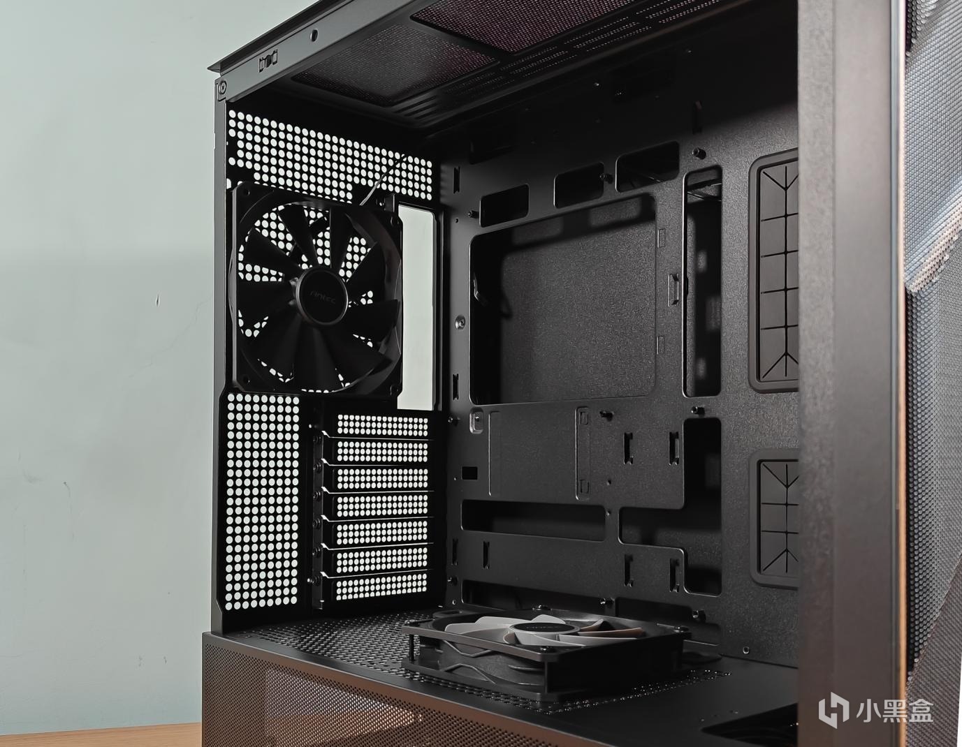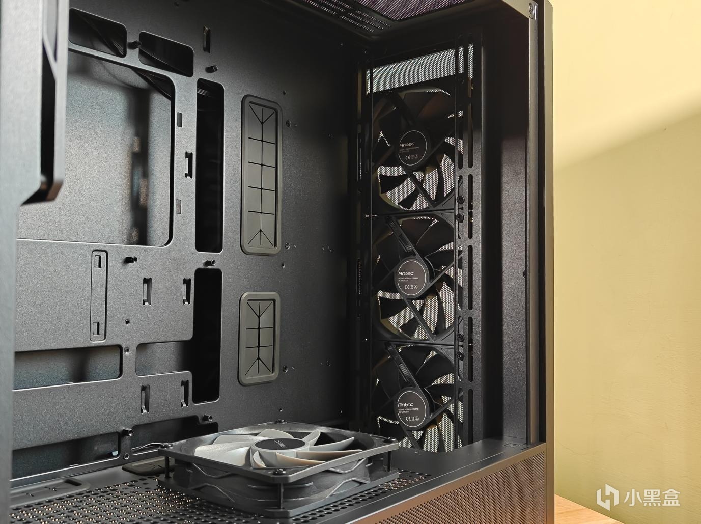 玻璃侧透是磁吸的,在前面板预装了3个120mm大风扇,这里的前面板可以支持最大420mm水冷或者3个140mm风扇。同时电源仓上面也有散热设计,支持最大2个140mm风扇,出厂预装了一个120mm风扇。