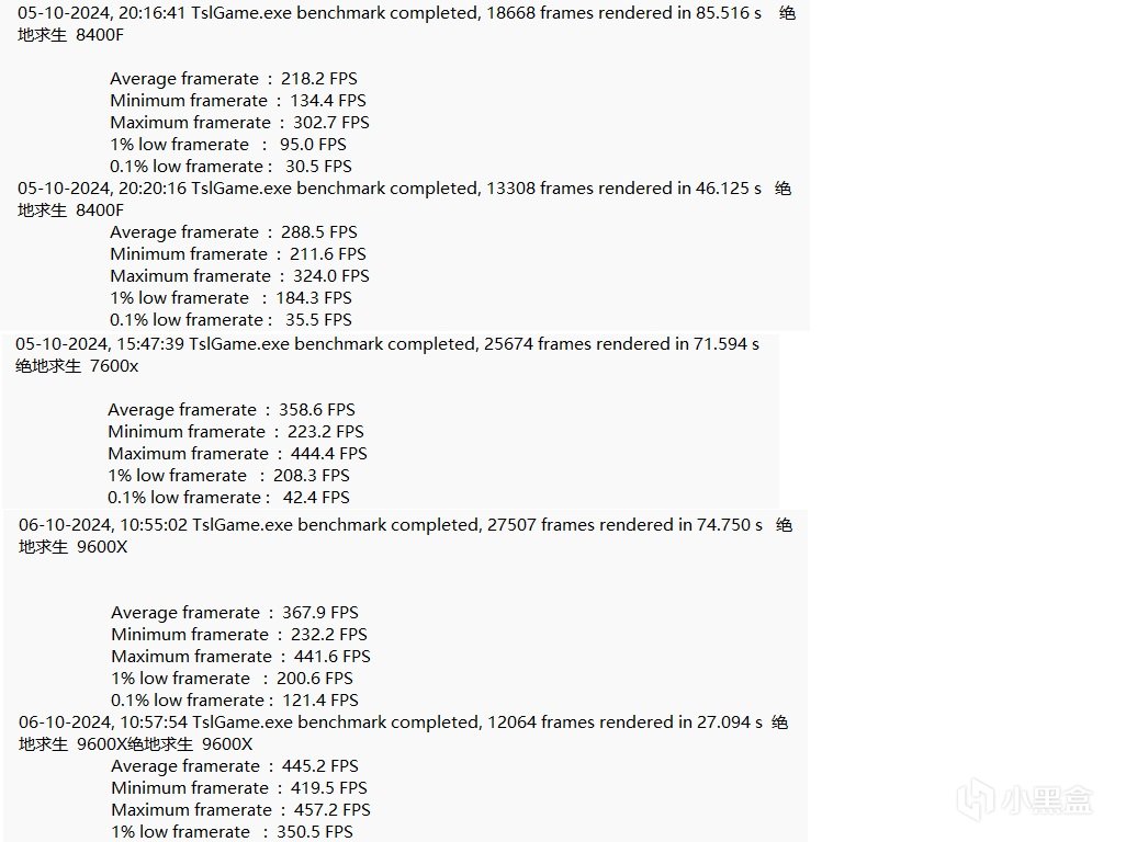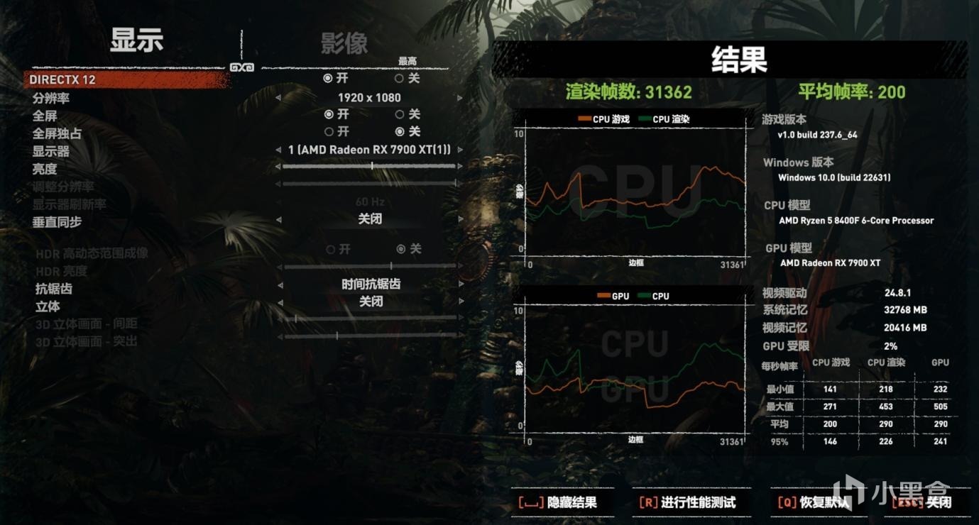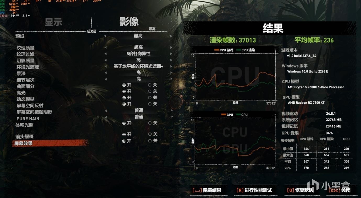 古墓丽影.暗影,3种不同高度CPU下,平均帧率分别是200帧、236帧,249帧。具体到单个的项目,8400F下,平均帧数CPU游戏200,CPU渲染290,GPU290。7600X下,平均帧率,CPU游戏247,CPU渲染342,GPU300。9600X下,平均帧率CPU游戏268,CPU渲染388,GPU301。同样是有影响的。