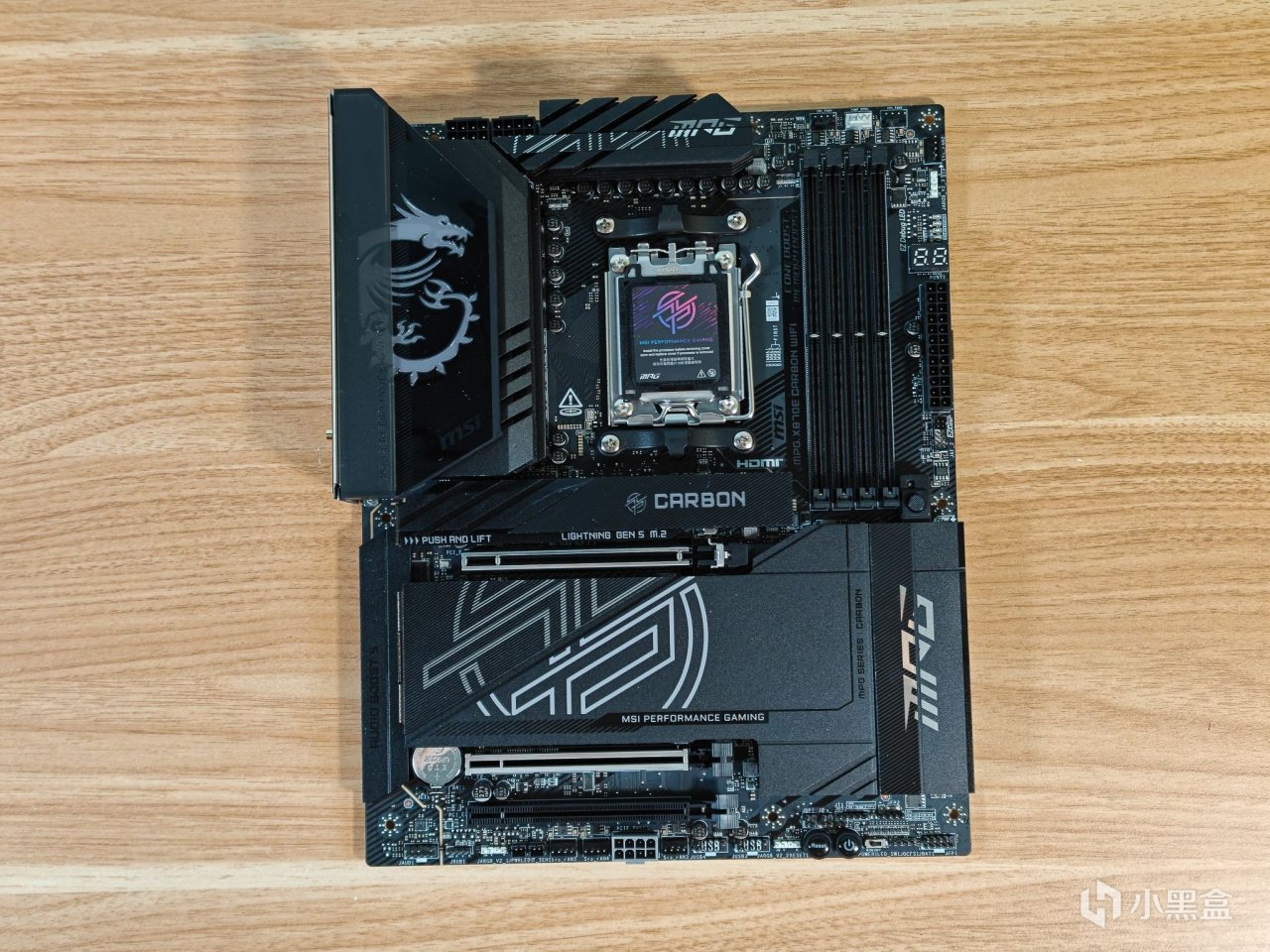 为了确保CPU的性能能完全得到发挥,所以测试用的主板,选择了中高端的微星MPG X870E CARBON WIFI,著名的暗黑系列主板。这款主板整体暗黑色,ATX规格,大面积的散热装甲的设计。供电方面,主控主板采用了18+2+1相供电设计,高达110A的供电能力,即使是顶级CPU也是应对有余。服务器级别材料、厚达2盎司铜8层PCB板材设计。 散热方面,硕大的一体式散热,折叠设计的VRM散热装甲以增大散热面积,M.2插槽和南桥上面有大片的散热装甲覆盖。
