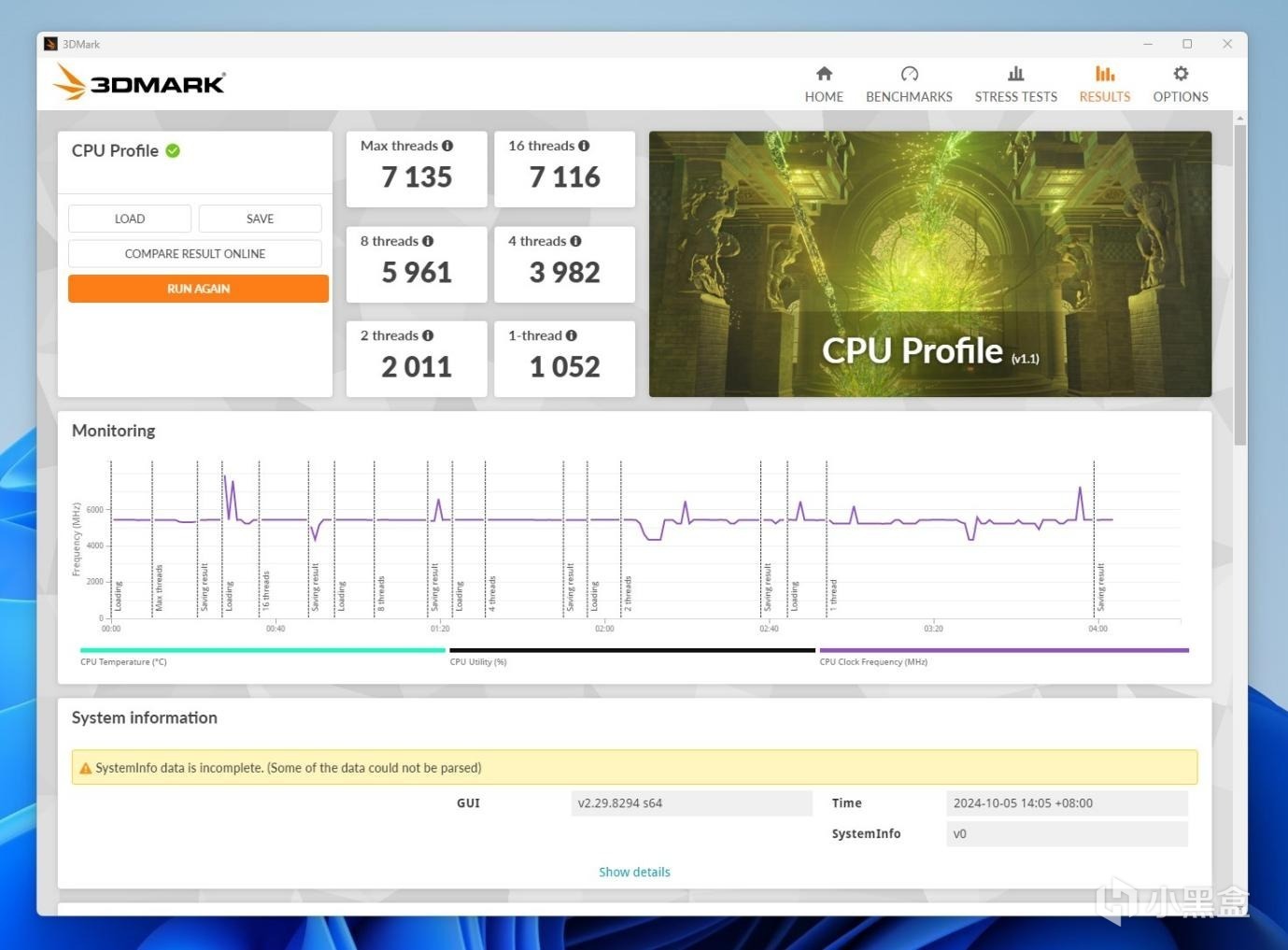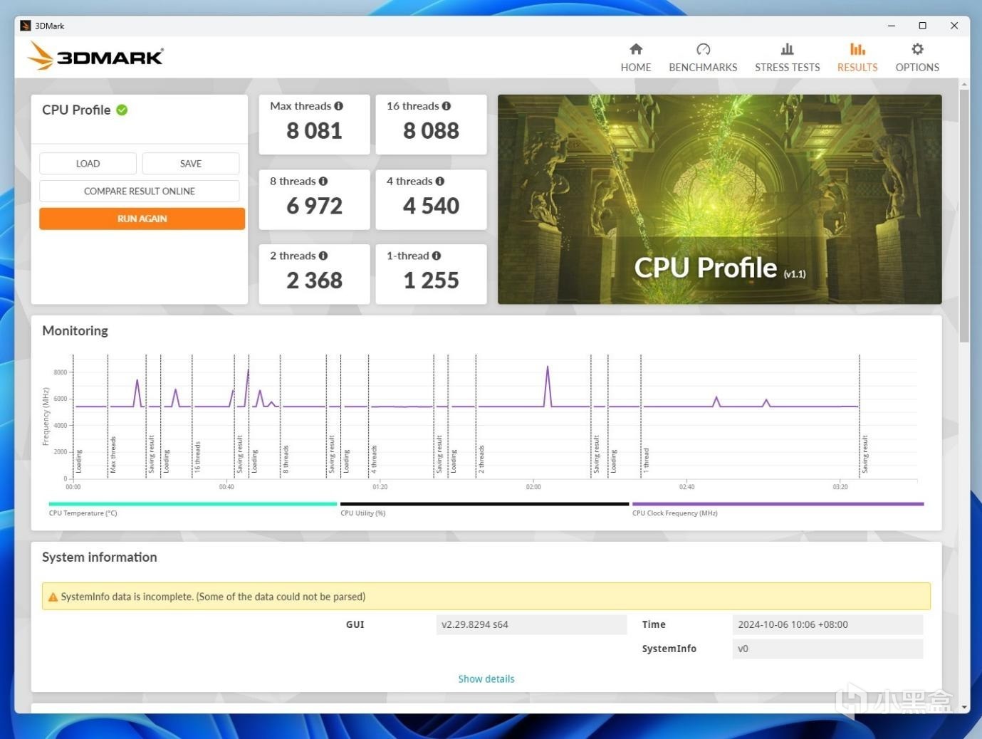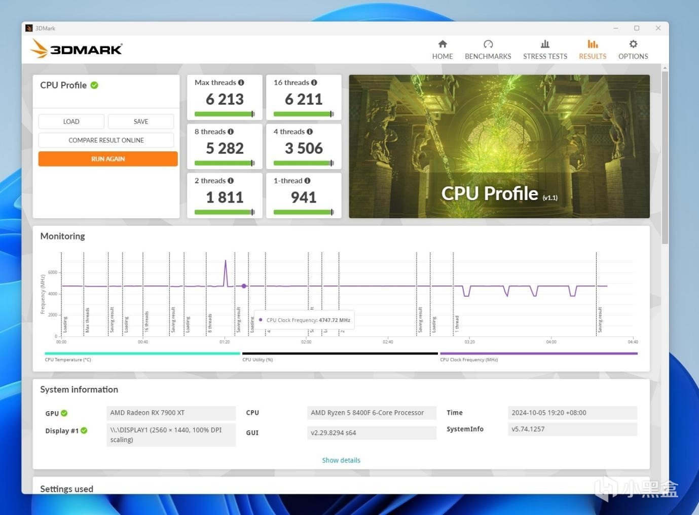 3DMARK CPU Profile,8400F单线程941,最大线程6213;7600X单线程1052,最大线程7135;9600X单线程1255,最大线程8081。