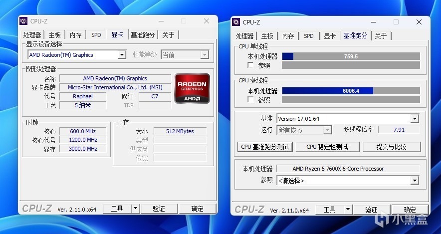 CPU-Z的跑分,这个跑分浮动较大,不过还是能看出明显的区别。8400F单核627.3,多核5079.8,7600X单核759.5,多核6006.4,7900X单核832.6,多核6625.5。