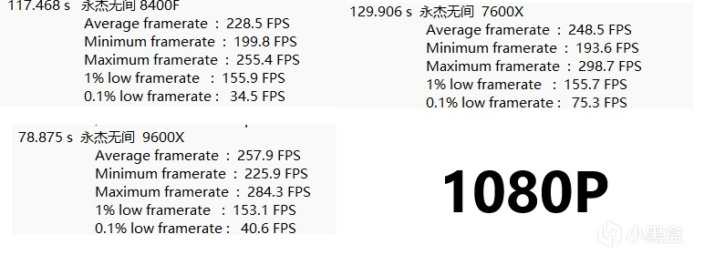 1080P分辨率下,平均帧率,三个CPU下分别是228.5FPS,248.5FPS,257.9FPS。