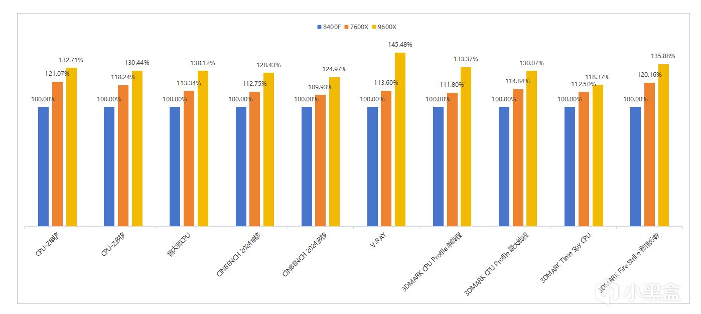 我们让大家更好的看到 数据线的对比关系,将上面的数据做了整理。以8400F的数据作为100%,来看下其他2个CPU,7600X和9600X在各个测试项目里的增长。