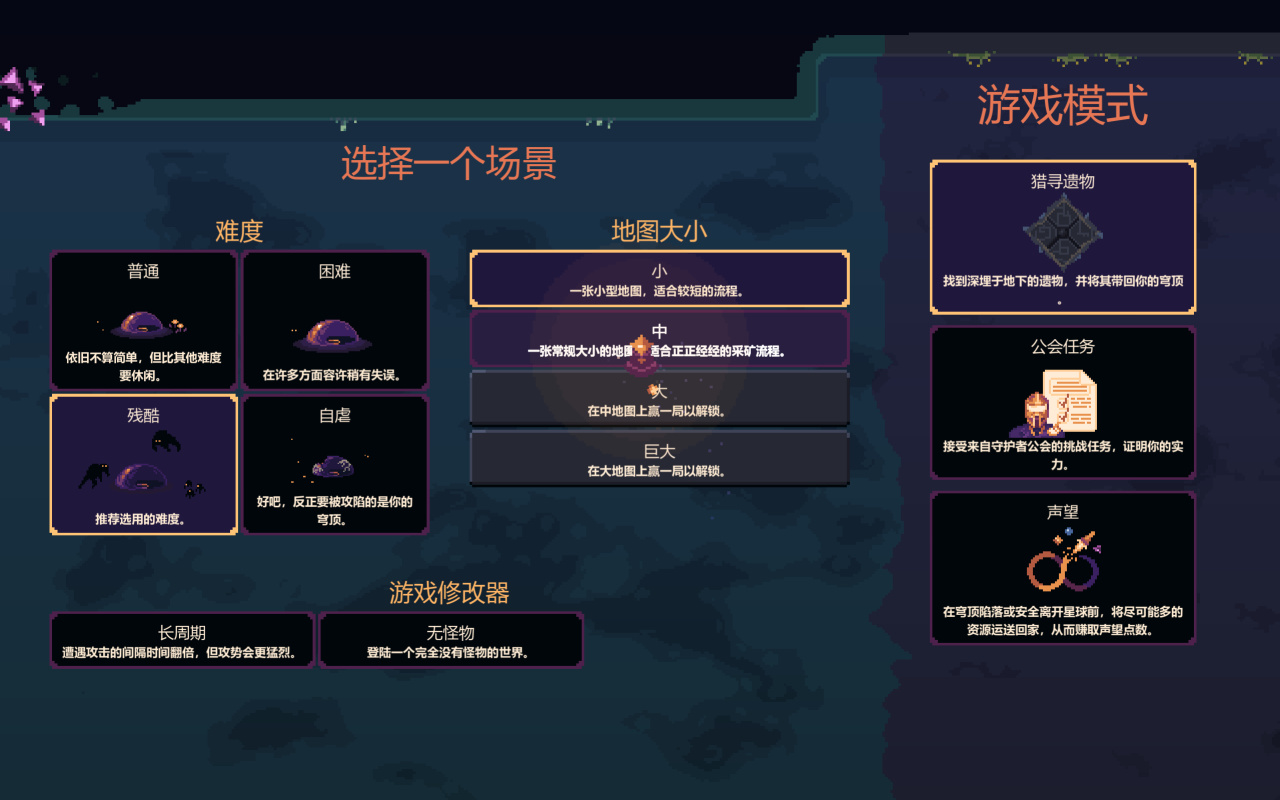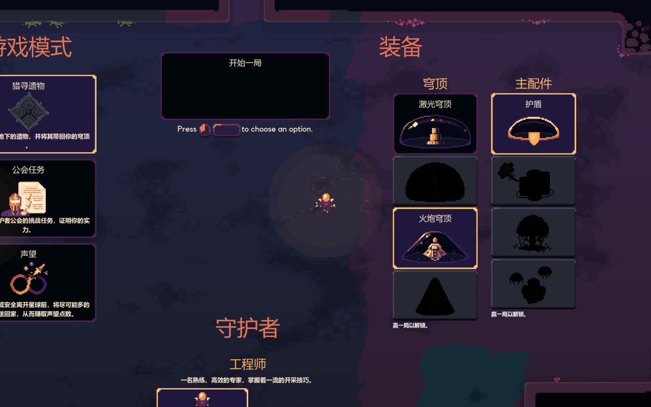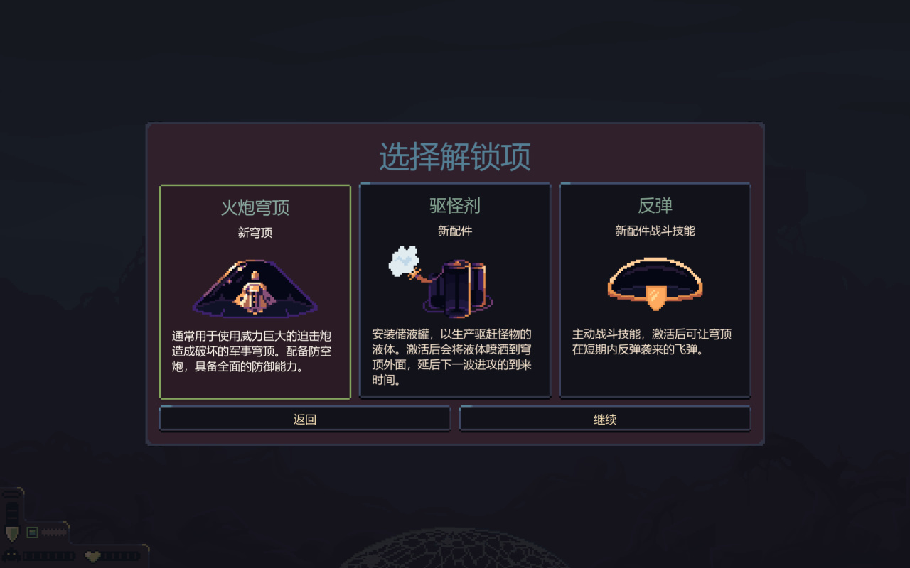《穹頂守護者》是一款肉鴿挖礦生存遊戲,玩家來到異星,需要抵禦一波波來襲的怪物,通過開採地下礦石提升自己開採資源能力和防禦能力,在不斷抵禦下完成任務(如尋找遺物,開採鐵礦等)纔算成功