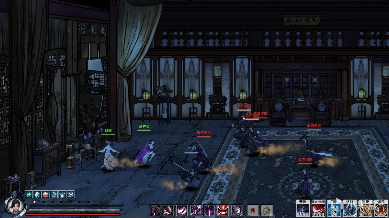 在战斗的过程中,玩家之前在秘籍中解锁的技能可以在下方的菜单栏找到,如鬼十斩+一闪这样的基础技能就可以通过键位上的1和2来释放。鼠标左键轻击,右键重击,搭配技能使用,掌握硬直击飞+轻击的一套连招基本可以让敌人在空中一直保持被击飞的状态。(这也是战斗中一个比较逆天的操作)