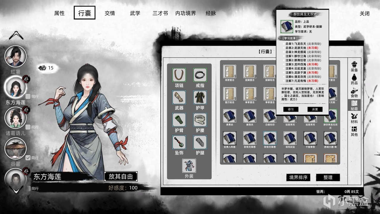 游戏对于秘籍功法的学习也有很高的开放度,玩家可以给随从或者自身修习任意流派的招式,不过如果要装备相应流派的兵器,则需要先学习这一兵器的散学。像笔者一般有新角色入队以后,第一步就会查看人物的属性面板,为人物特别突出的属性部分开始规划做重点培养。