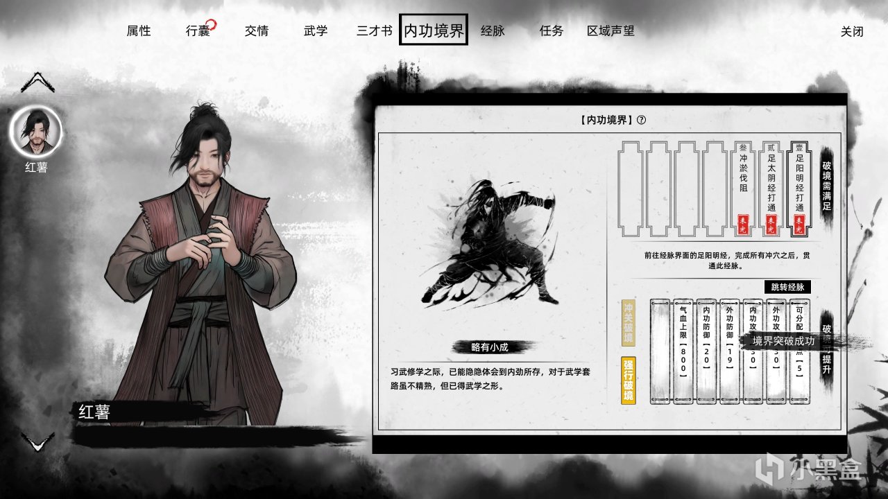 在《刀剑江湖路》中虽然不限制玩家的游戏实力,初始境界也能靠强大的队友(吃软饭)打通关,但玩家为了击败高强度敌人或者装备高强度武器而有境界上的需求时,就需要跟随剧情来到某个地区完成前置任务。(在9月30号更新的0.5.2.3版本后,已经可以强行破境而不做剧情任务)而玩家想破境就必须先完成打透穴位的前置任务,破境后带来的不止是角色属性数值上的提升,还可以提供5点左右的额外可分配属性点。