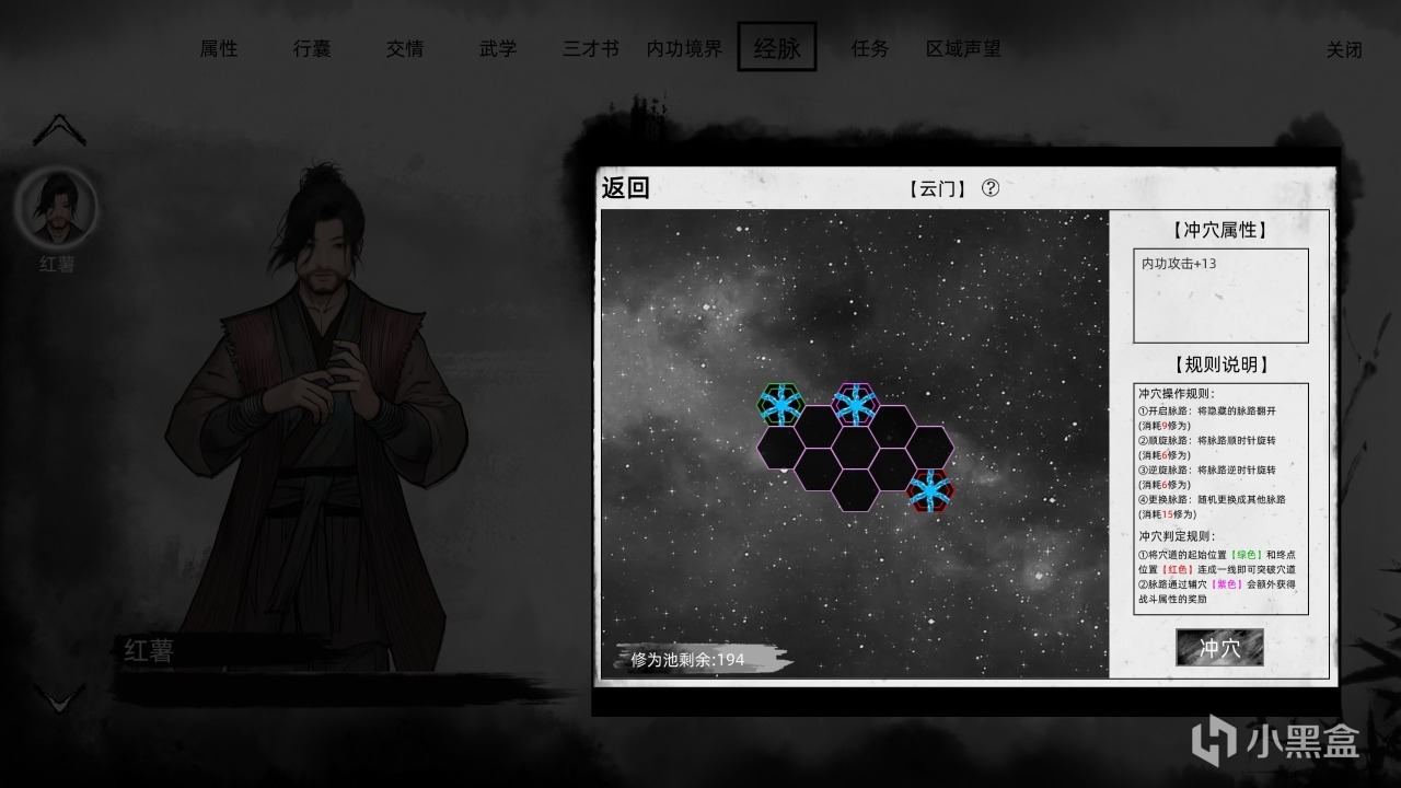 玩家可以消耗在战斗中获取的修为来进行冲穴,达成洗髓破境的效果。冲穴的过程既可以通过自动模式直接跳过,也可以依靠玩家自身对“连连看”有信心的操作来进行挑战。从绿点连接到红点的途中,玩家必须保证两格穴道之间的连接是相互贯通的。