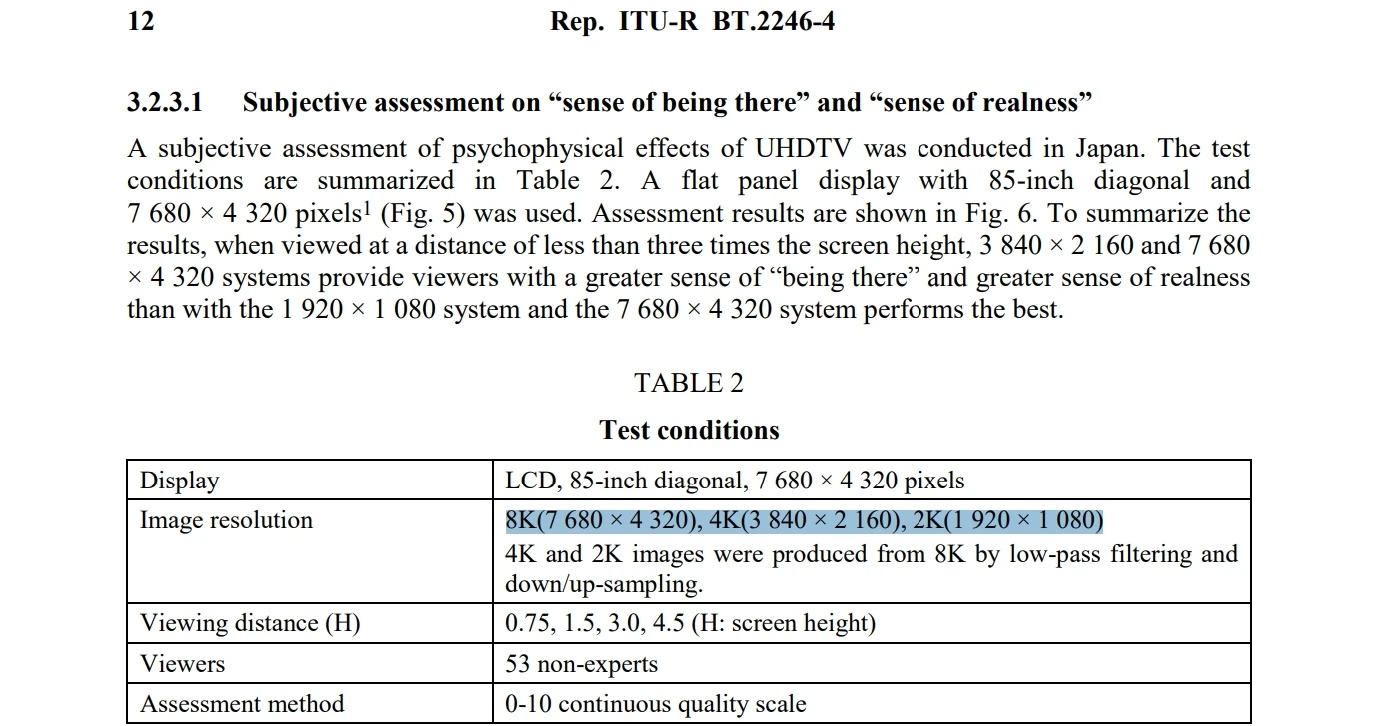 - 2012年,國際電信聯盟無線電通信部門(International Telecommunication Union, Radiocommunication Sector,ITU-R)發佈了ITU-R BT.2020建議書,也稱爲超高清電視(Ultra High Definition Television,UHD)標準。該建議書採用了與SMPTE ST 2036-1所定義的完全一致的圖像參數