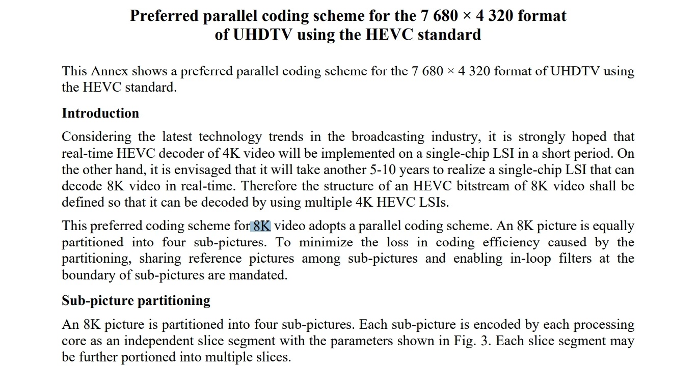 - 2007年,美國電影電視工程師協會(Society of Motion Picture and Television Engineers)發佈了標準 SMPTE ST 2036-1,定義了超高清電視的兩個UHD系統:UHDTV1的分辨率爲3840x2160