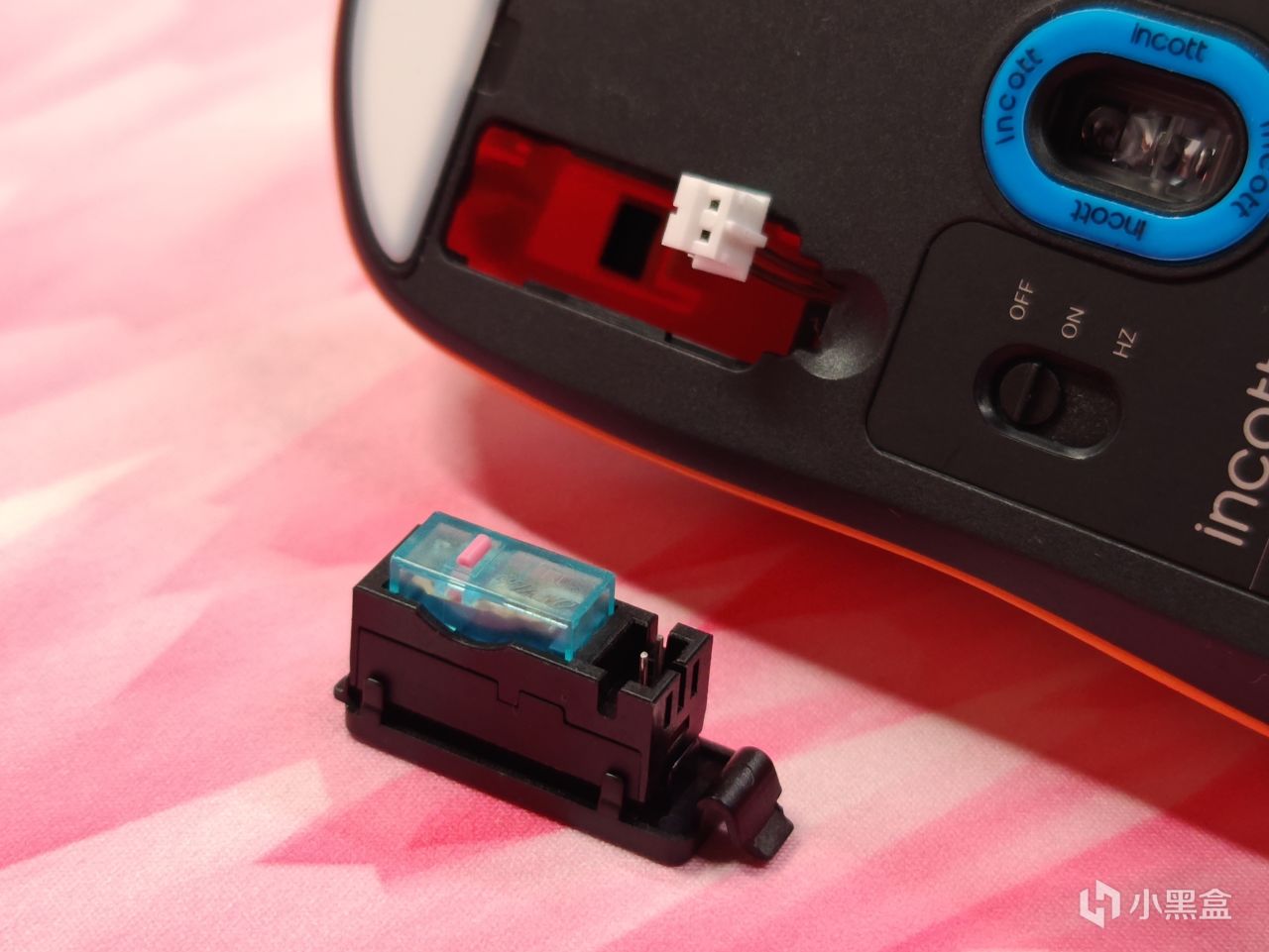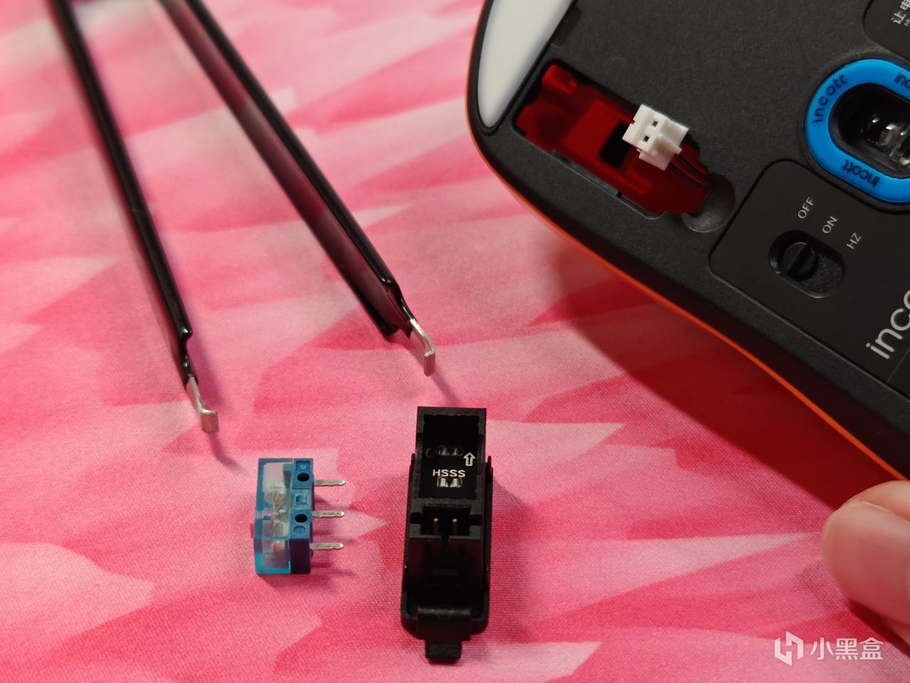 拨开卡扣,拔下连接座即可取下微动和底座,再用随盒附赠的微动夹即可拔下微动,全程无难度。唯一要注意的是,千万别把成功托付给大力,别上蛮劲,要不然排线断了就G