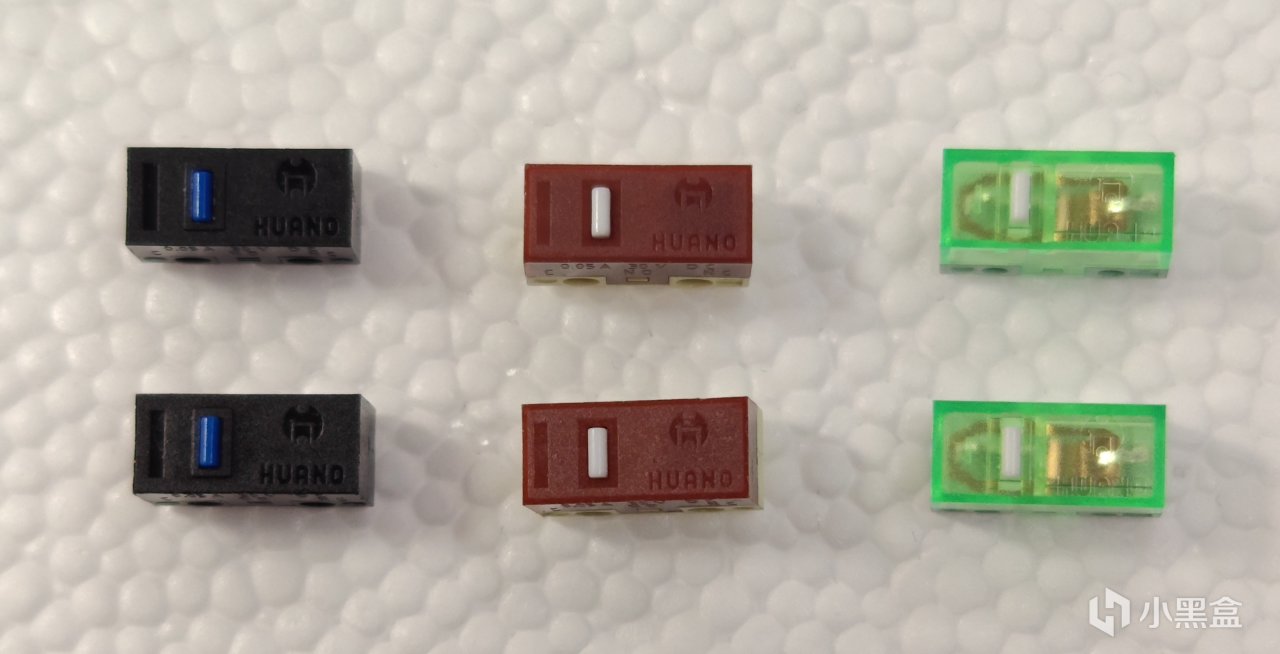 随鼠标附赠的有三对微动,都是来自环诺。鼠标自带的为环诺粉点,附赠的分别为黑壳蓝点、棕色白点(静音)和绿透白点(段落,清脆),各有特色,覆盖全面。无论是深夜静音还是竞技迅捷,这几款微动都能覆盖使用场景,并且无需拆机即可完成微动更换,十分方便可用,三脚触点的微动兼容性也不错,可以自购其它微动进行替换。