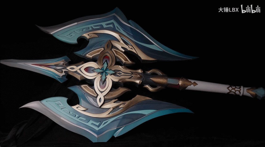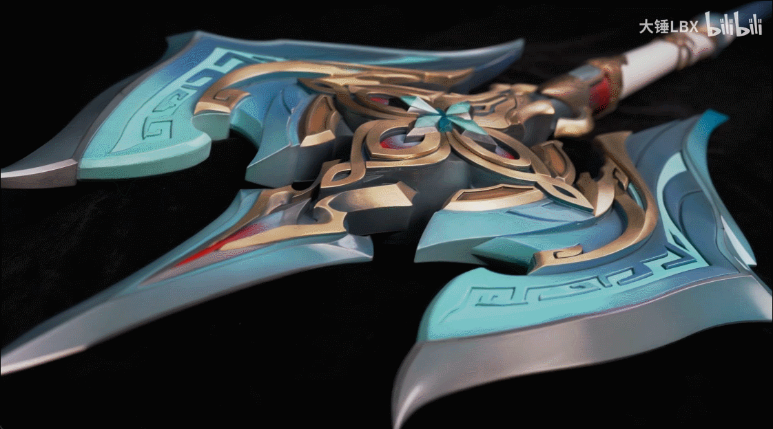 得票第三名的作品是由UP主大錘LBX製作的飛霄巨斧。這件作品結合了中國傳統的鍛造技藝與現代3D打印技術,先用傳統技藝鍛造武器主體,再通過3D建模,用高分子聚合物打印巨斧外部覆蓋件,最後經過手工切割、打磨、上色,再配合黃銅、人造寶石裝飾件,才終於打造出了這把巨斧。