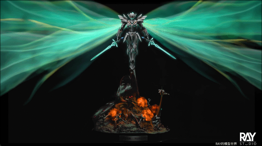 雖然是模型,但已經做出了雕塑的質感,因爲他的細節實在拉的太滿。底座部位還原了人氣PV“崩鐵:格拉默的餘燼”的悲壯場景,值得細細觀賞,主體部分關節可動,可以凹出不同造型,視頻展示時選取了薩姆釋放技能的瞬間,並在身後利用投影還原了展開的光翼,呈現出的效果讓人不得不佩服UP主的巧思。