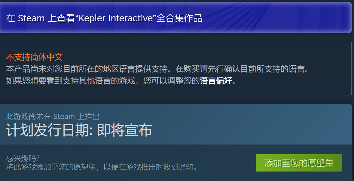 該遊戲steam界面顯示不支持簡體中文,但是鑑於遊戲在B站上有官方賬號,因此本遊戲有極大概率最後會支持中文。