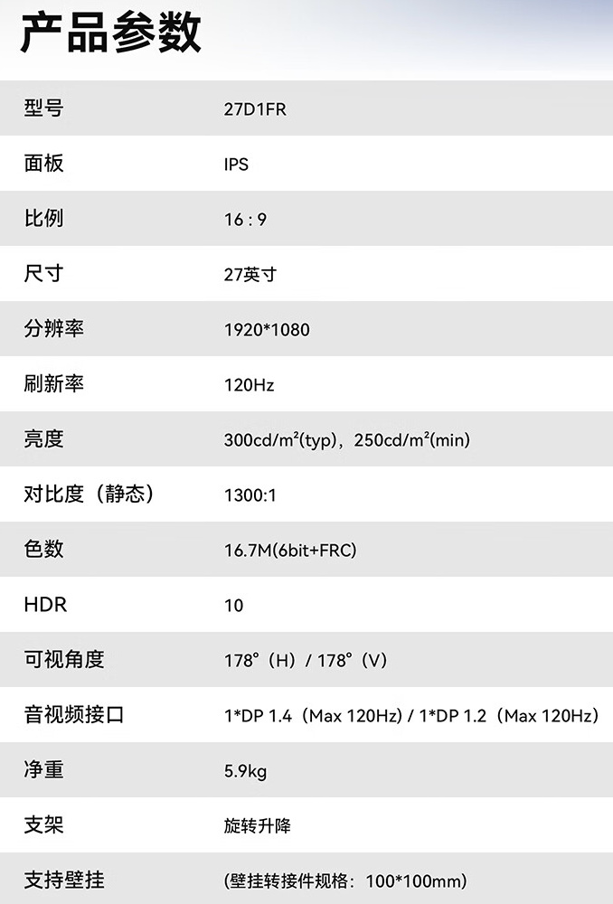 1920x1080,120Hz,27 寸 IPS,廣色域 99%srgb 90%p3 色域,300尼特,還支持硬件低藍光。
